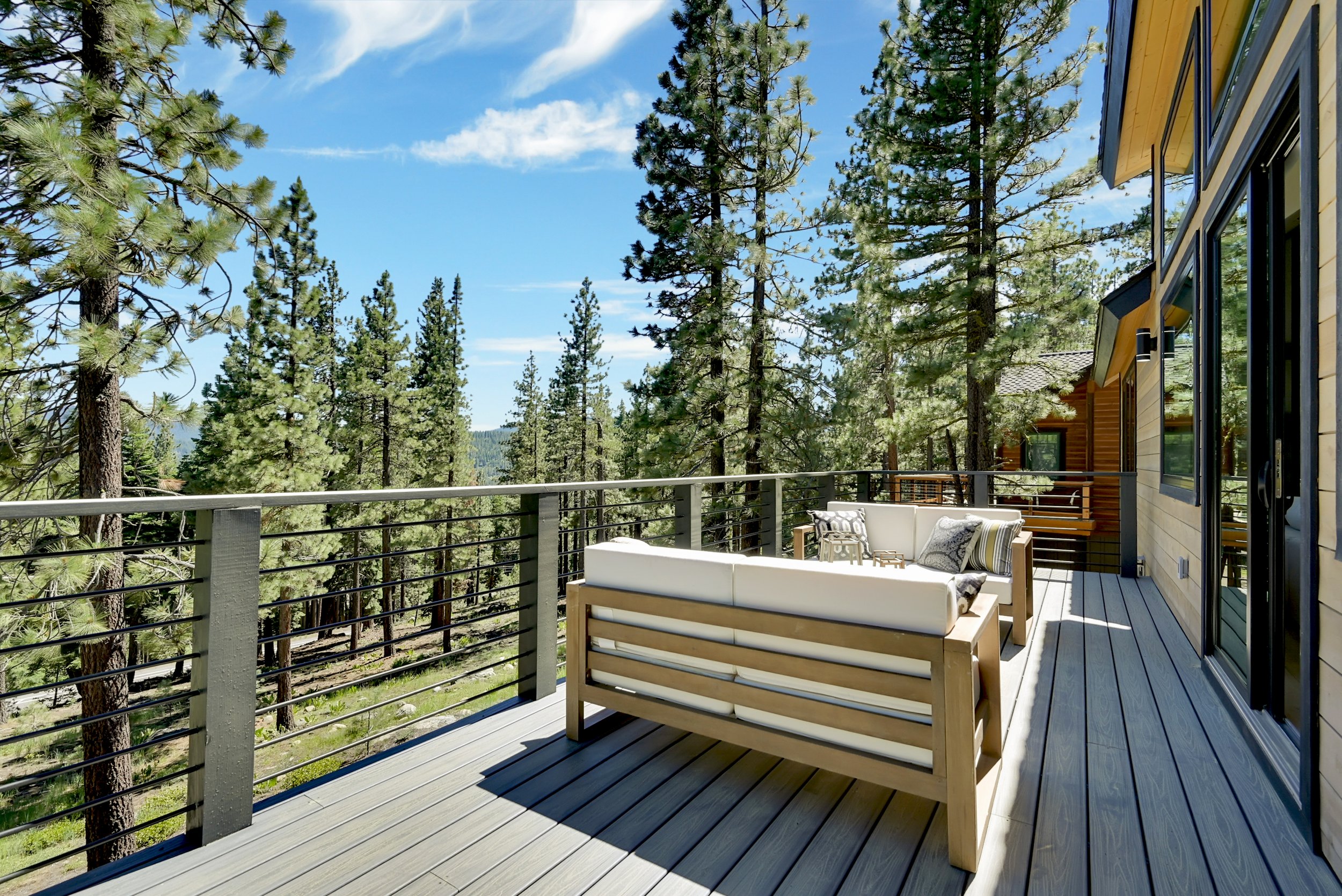 A spacious mountain-view deck surrounded by tall pines and endless forest scenery. Comfortable outdoor seating creates a peaceful place to relax, while the modern cable railing keeps the view open and unobstructed. With sunlight filtering through the trees and crisp mountain air, this deck offers a perfect blend of comfort and nature—an ideal spot for morning coffee or evening sunsets.
