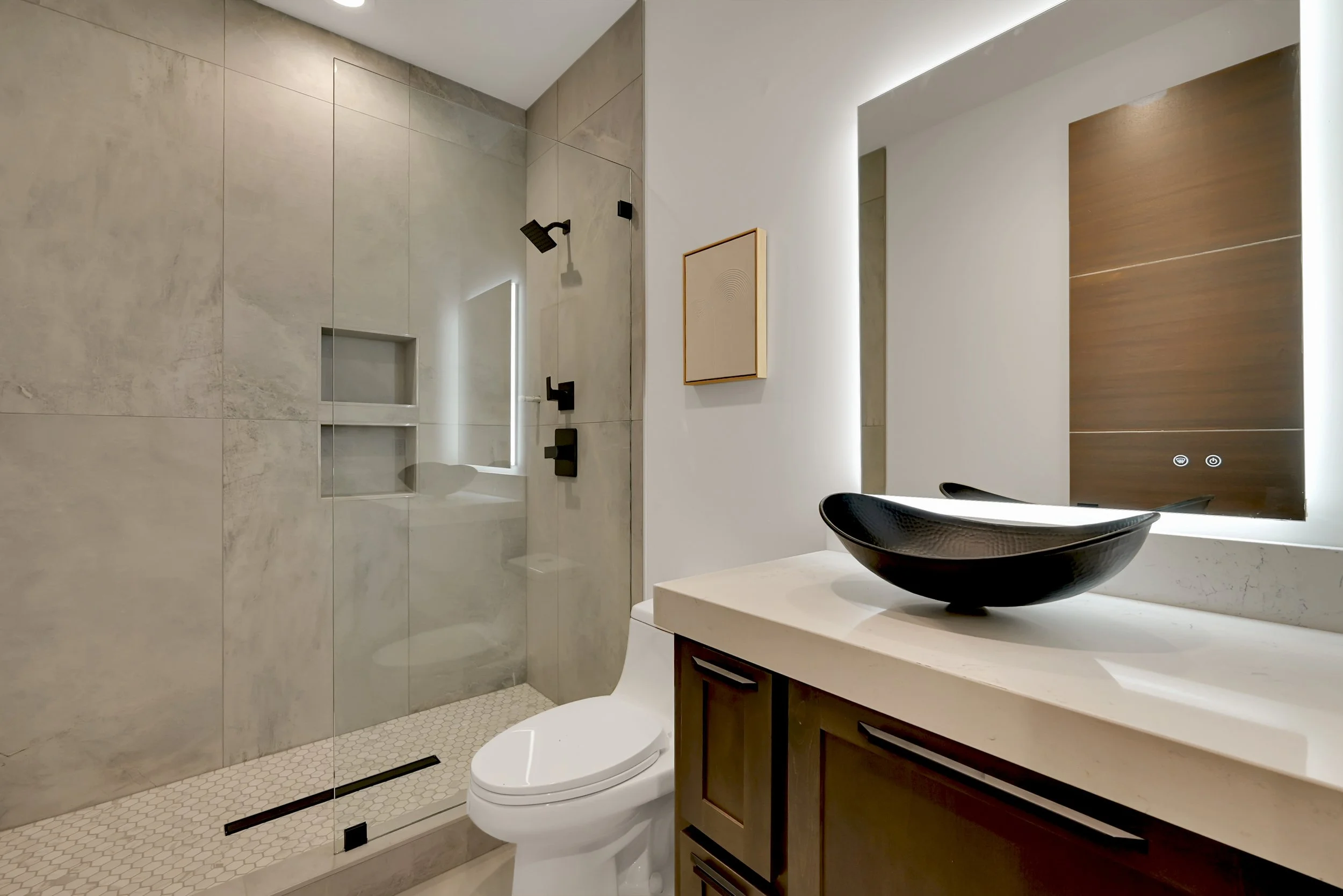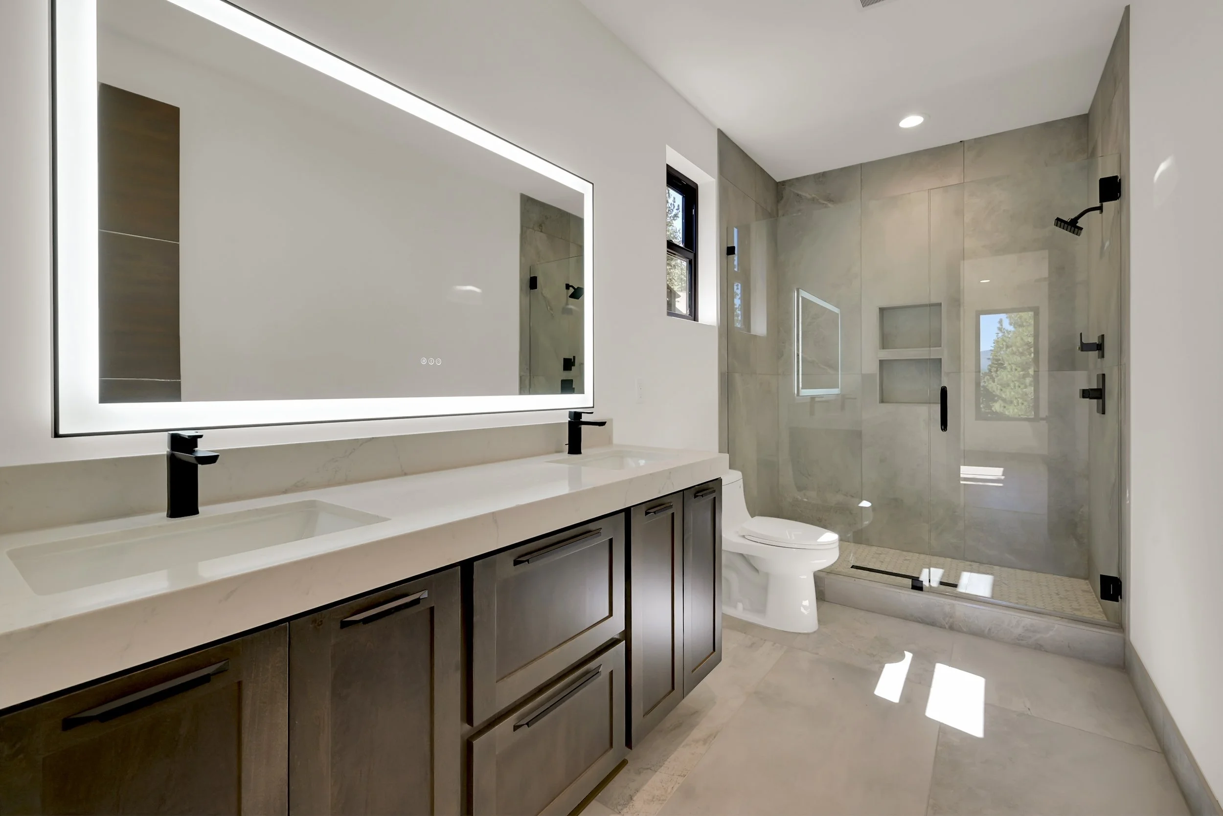 Sleek and spacious primary bathroom with a large walk-in shower, dual vanities, an illuminated smart mirror, and modern matte-black fixtures. Clean lines, warm cabinetry, and oversized tile create a luxury spa-like feel.