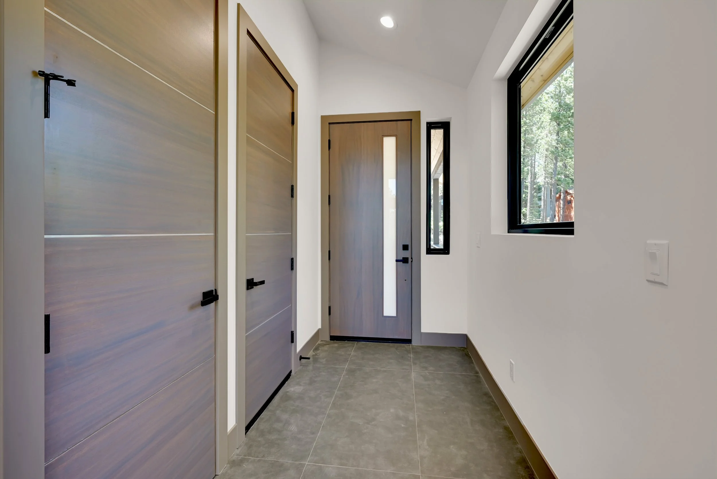 “A bright, modern entry hallway featuring clean lines, neutral tones, and large-format tile flooring. Warm wood interior doors with sleek black hardware add a contemporary touch, while the front door’s vertical glass panel brings in natural light. A wide window frames the surrounding forest, creating an inviting transition from the outdoors into the home.