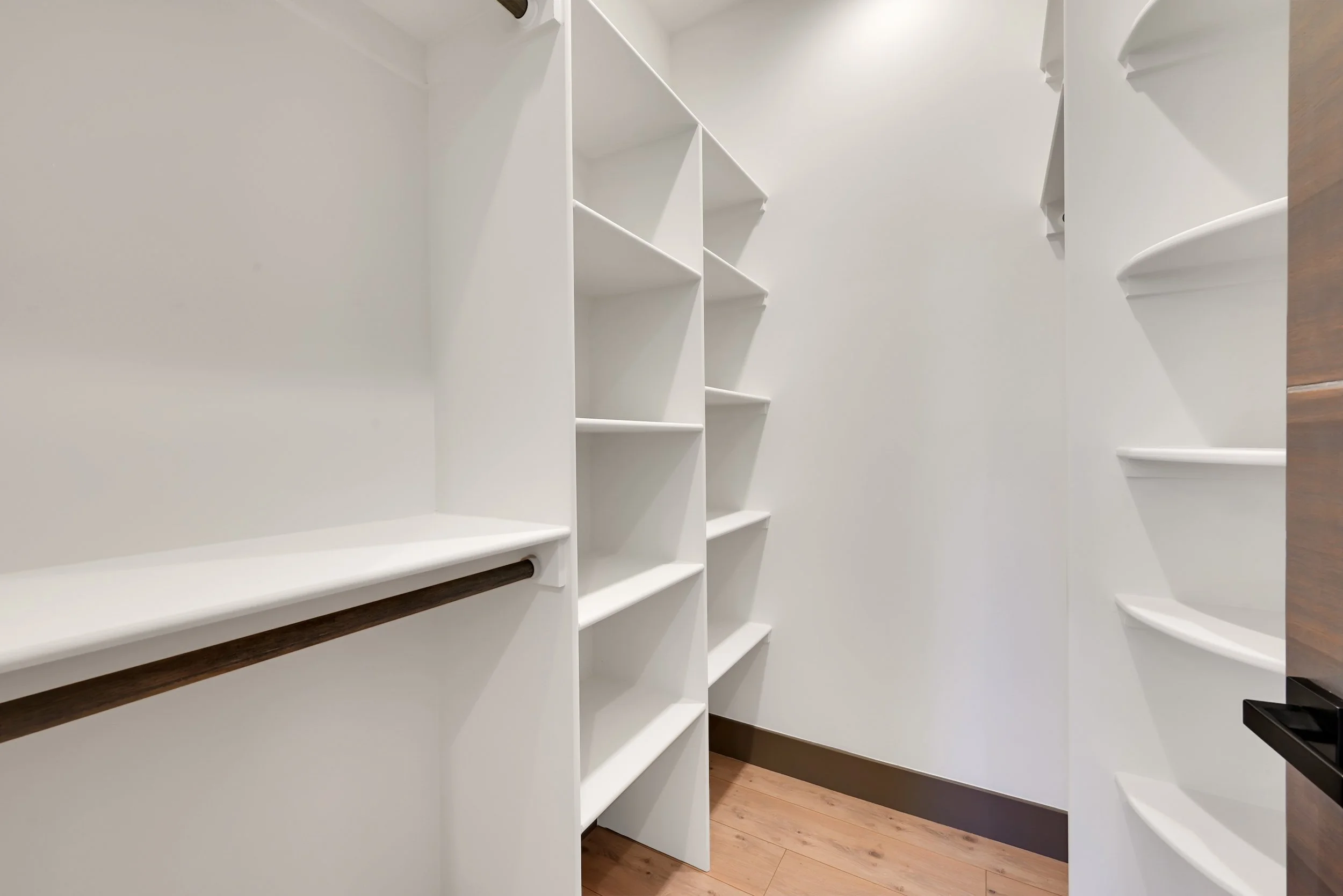 Bright, well-organized walk-in closet with custom shelving and ample hanging space — perfect for keeping everything neatly arranged.