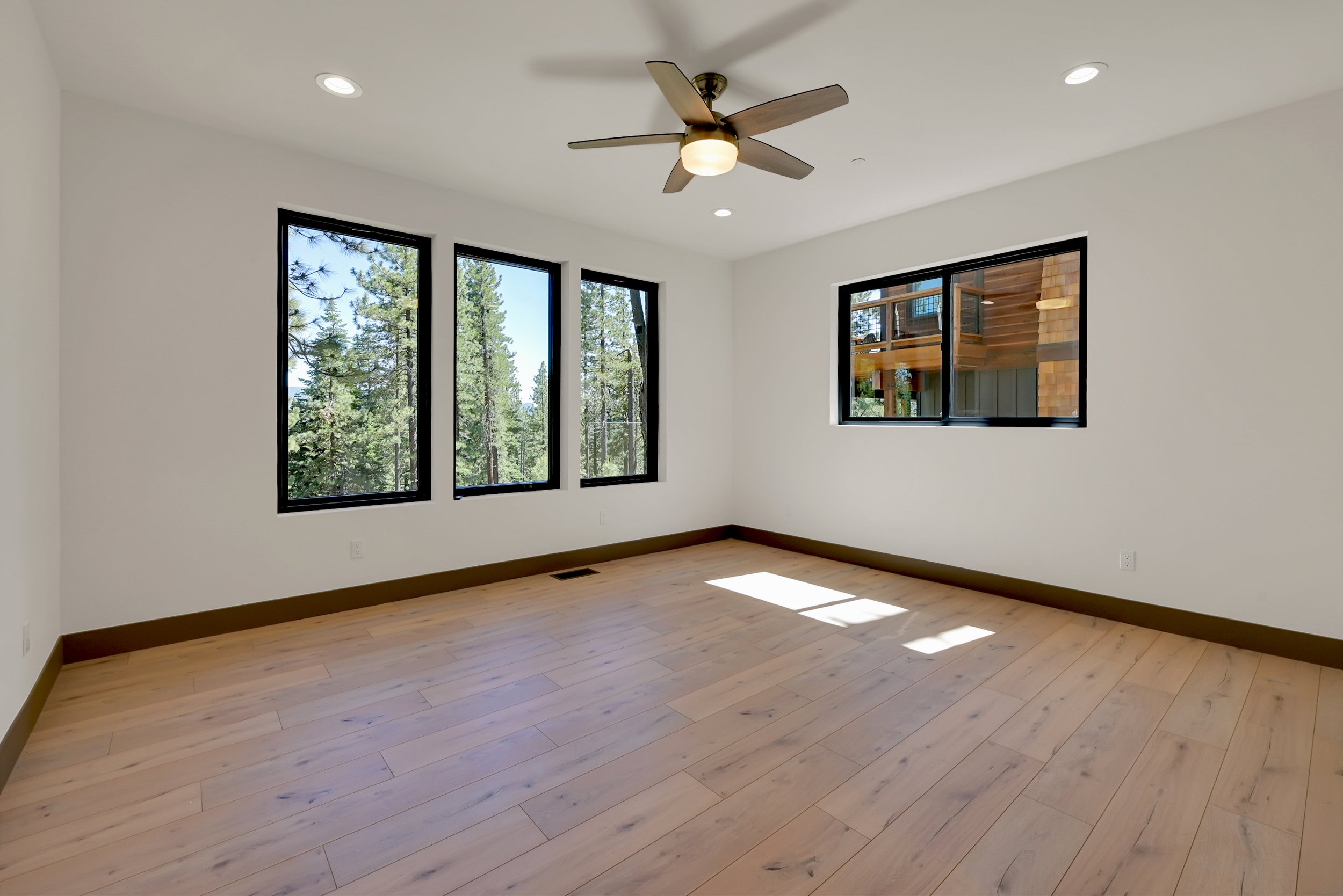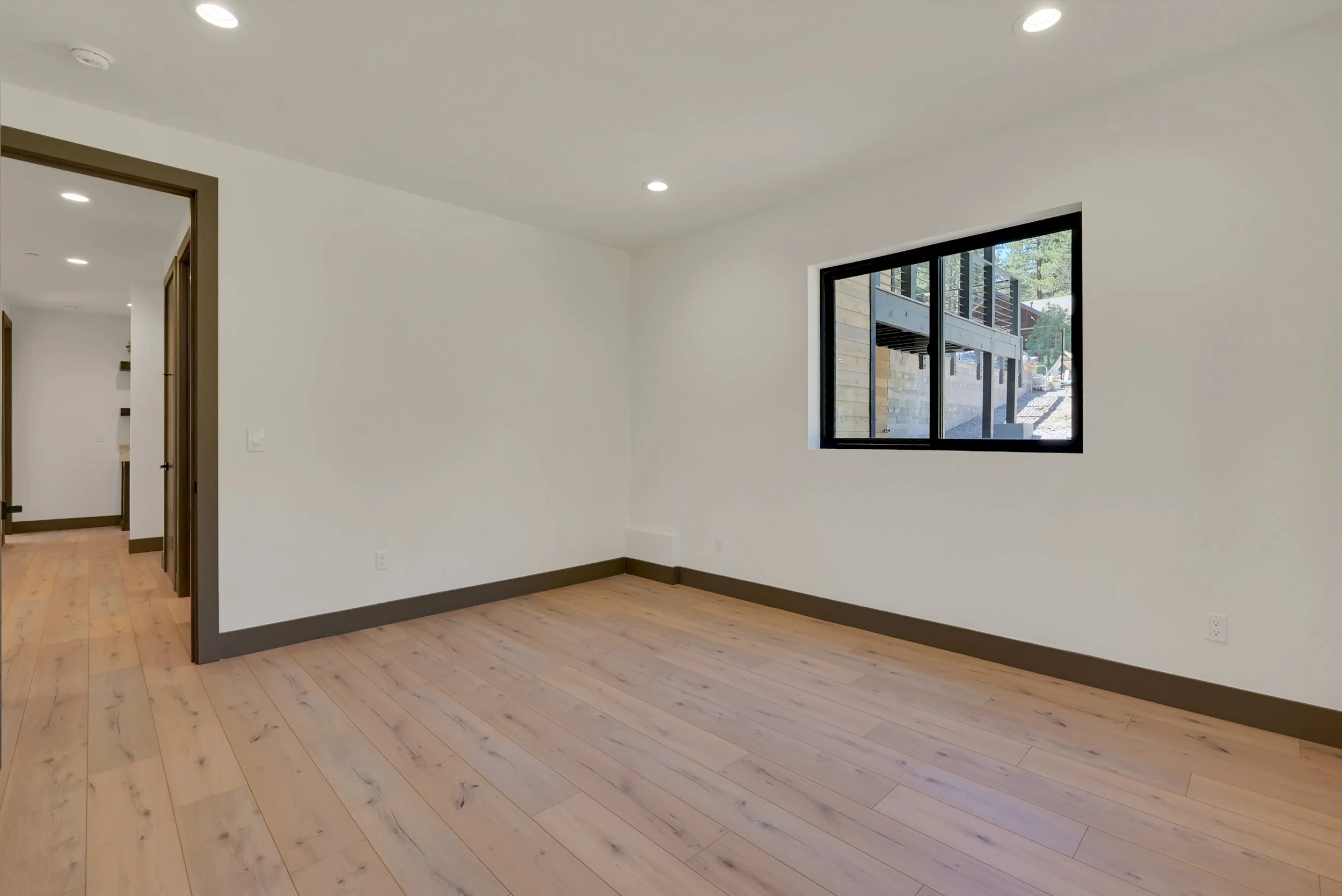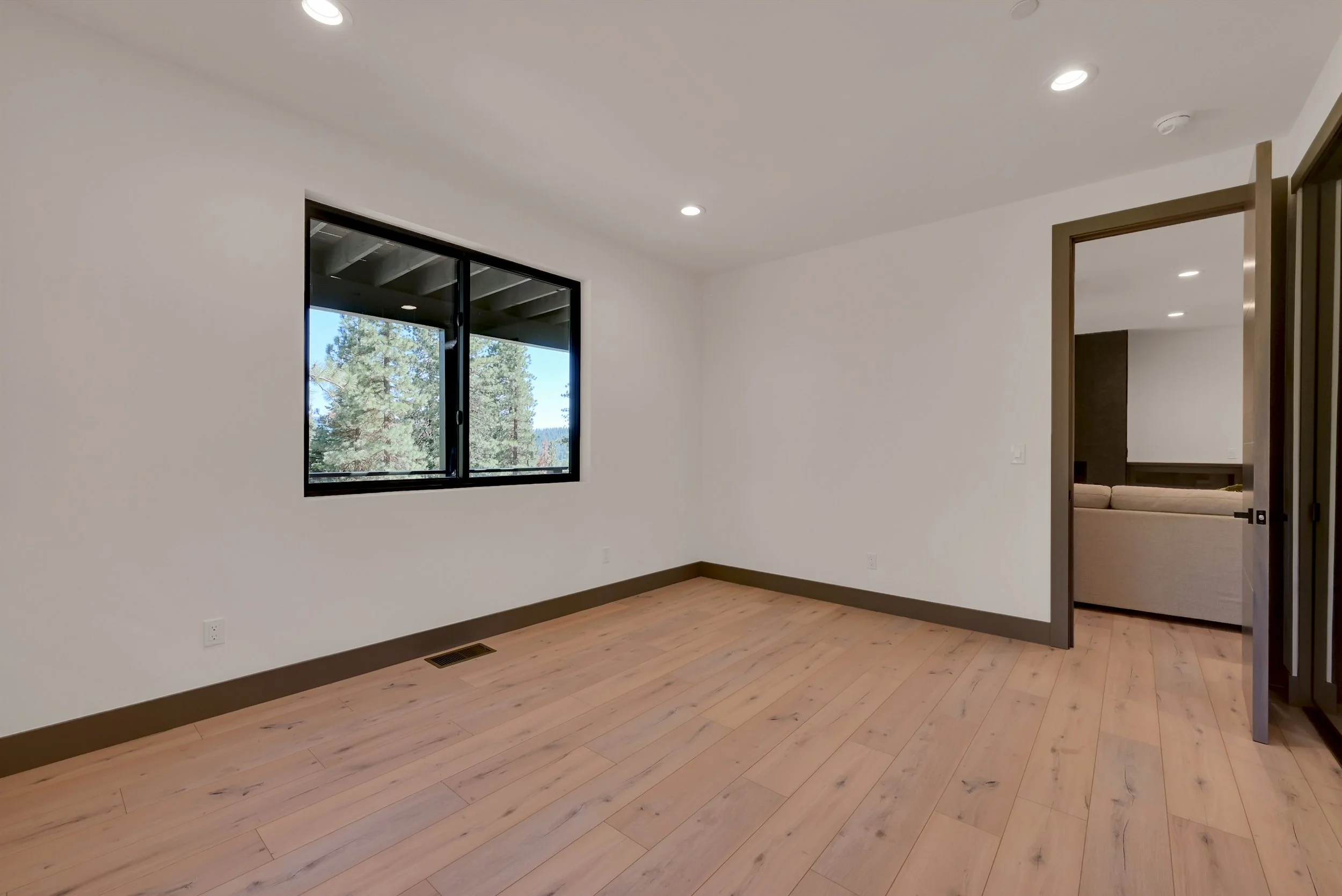 A clean and spacious bedroom with warm hardwood floors, soft recessed lighting, and a large window overlooking the side deck. The simple layout and neutral palette make it a flexible space for guests, an office, or a cozy retreat.