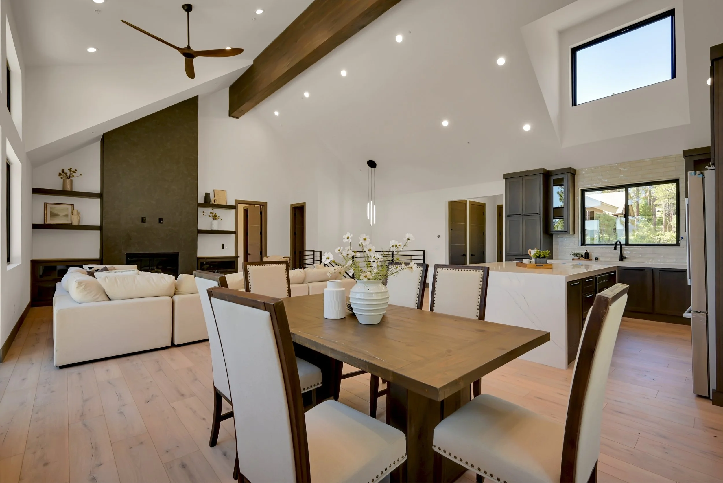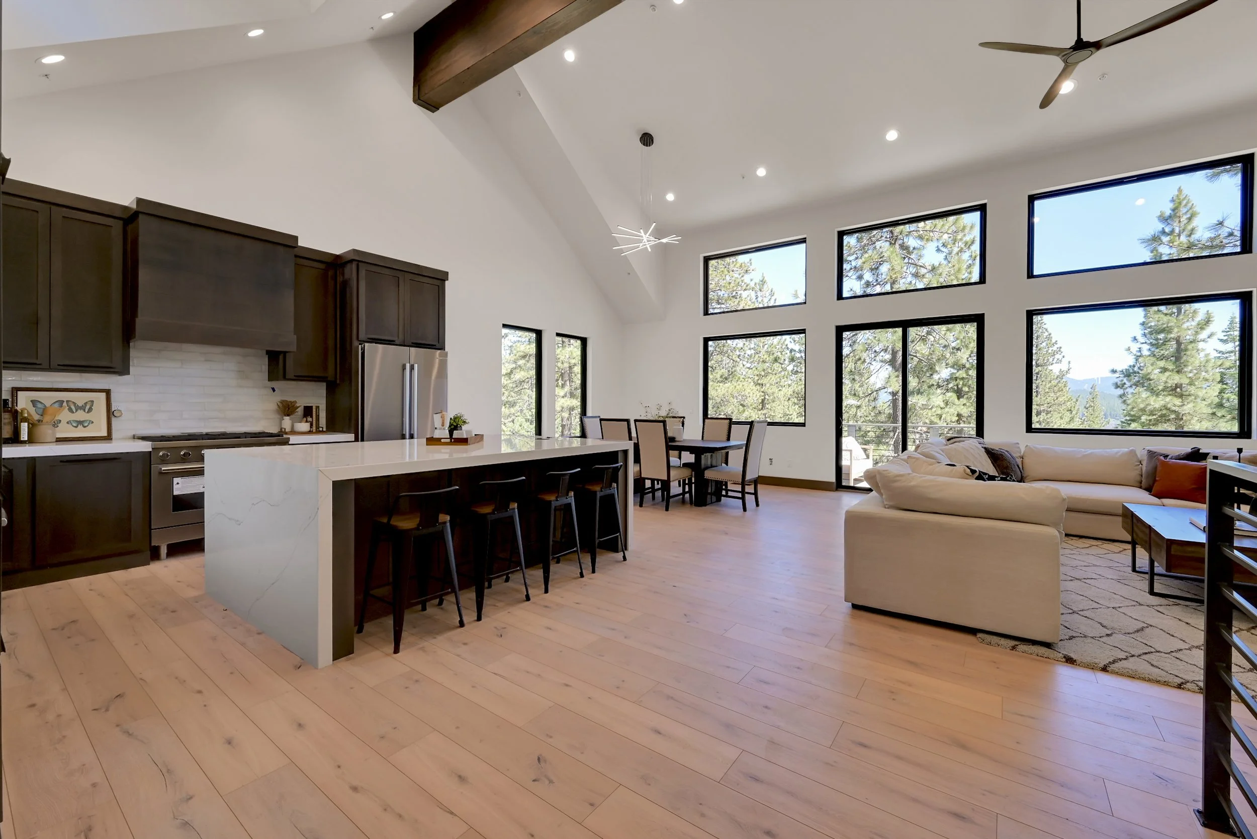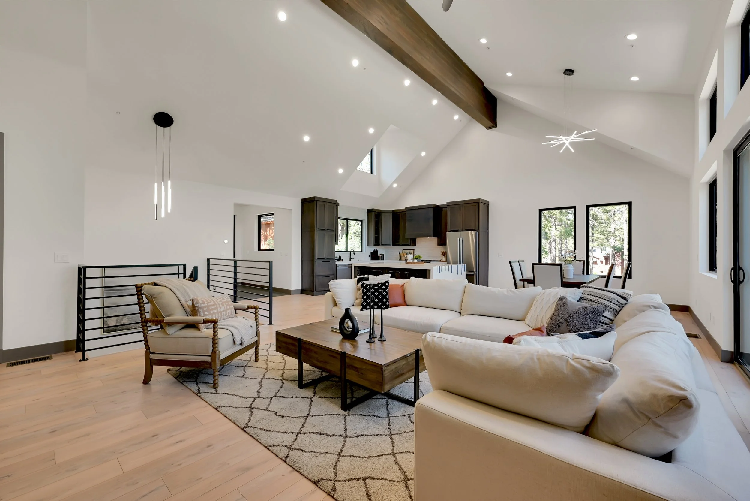 A spacious open-concept great room with soaring vaulted ceilings, exposed wood beams, and sleek modern lighting. The large sectional sofa anchors the living area, creating a warm and inviting gathering space that flows seamlessly into the dining area and contemporary kitchen. Light wood flooring, oversized windows, and soft natural light enhance the bright, modern mountain feel of the home.
