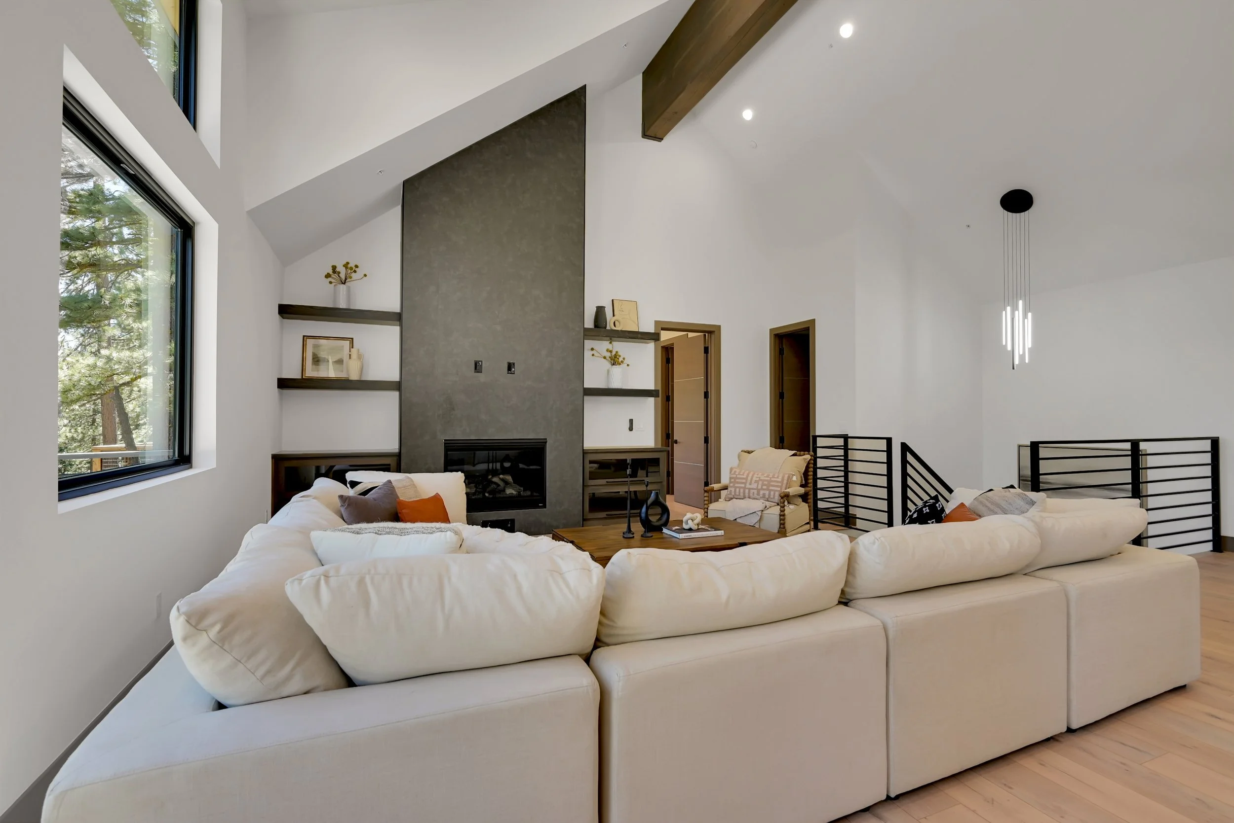 A bright, open living space featuring a contemporary floor-to-ceiling fireplace with built-in shelving on both sides. The vaulted ceilings, exposed wooden beam, and soft natural light create an airy, modern mountain atmosphere. A large plush sectional anchors the room, offering a cozy place to relax while wide windows frame the surrounding forest. Warm wide-plank wood floors tie the whole space together, blending comfort and clean modern design.
