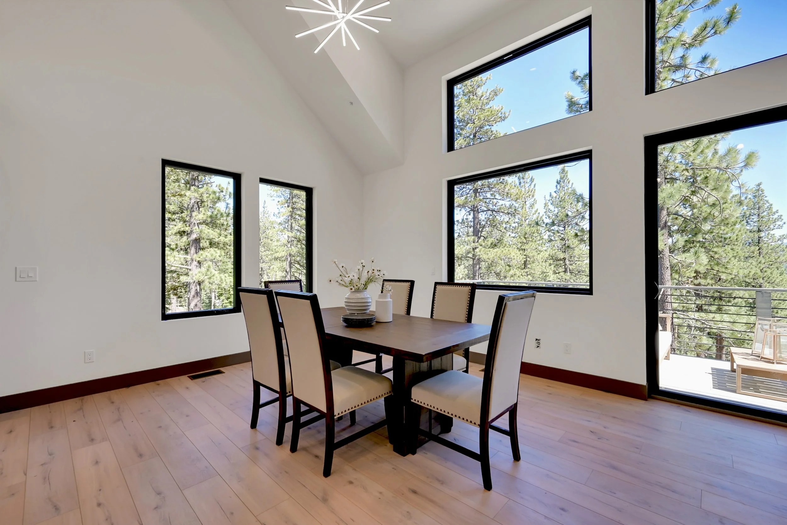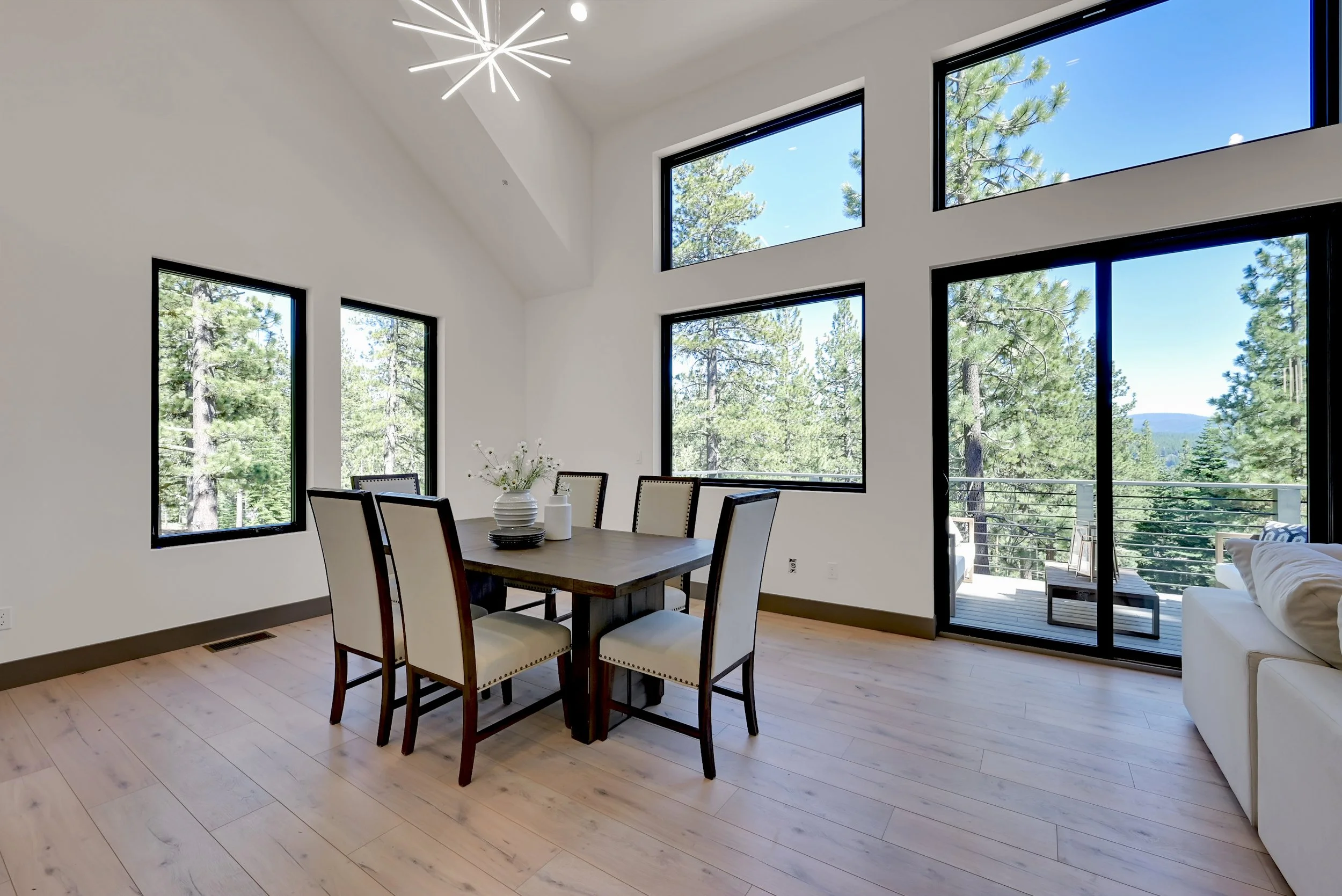 A bright, open dining area surrounded by oversized picture windows that capture stunning views of the surrounding forest and distant mountains. Natural light fills the space, highlighting the warm wide-plank wood flooring and clean modern design. A contemporary chandelier adds a stylish touch above the simple, elegant dining set, creating a peaceful place to gather and enjoy the scenery