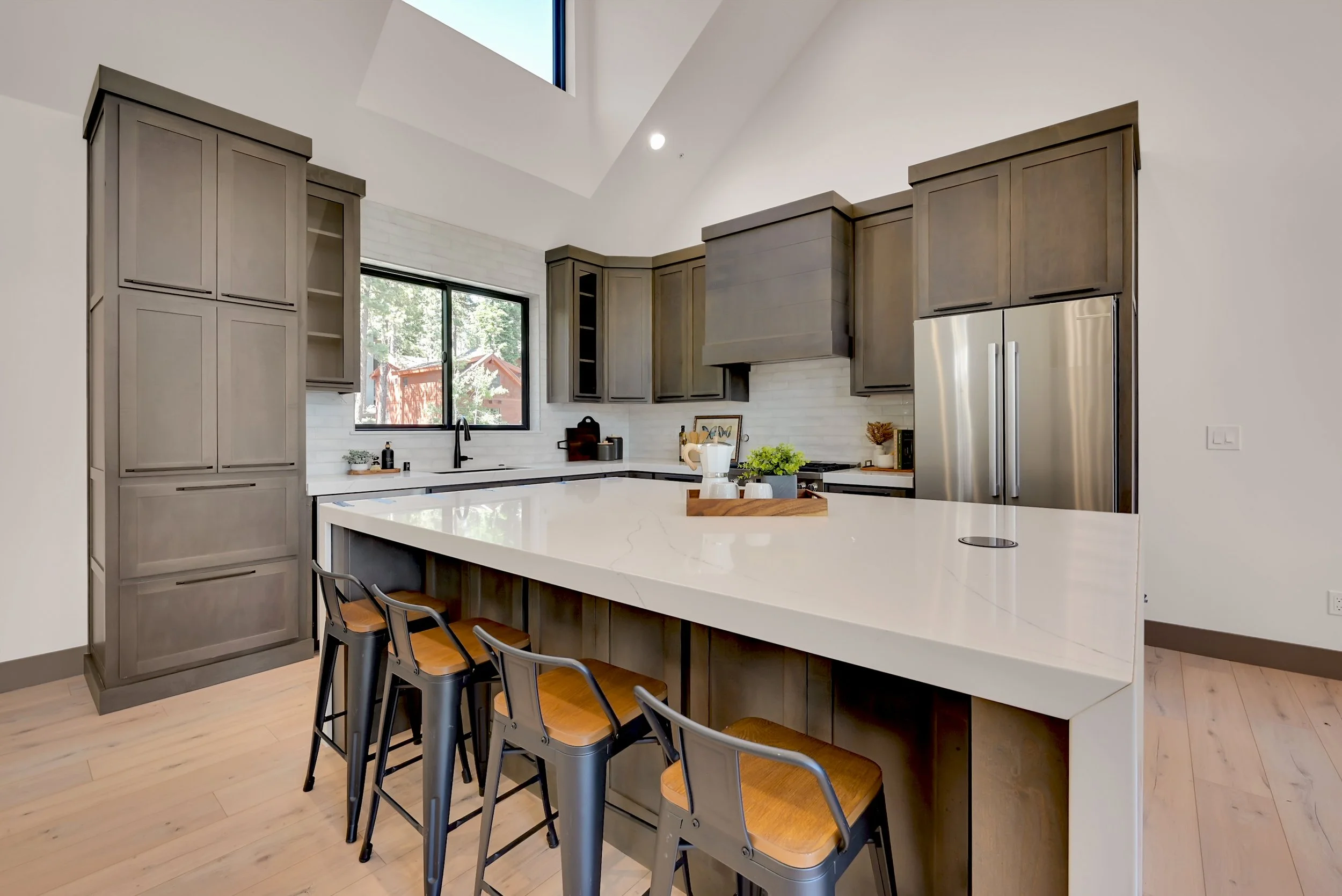 A modern chef-inspired kitchen featuring sleek dark cabinetry, a large waterfall-edge island, and high-end stainless steel appliances. The bright quartz countertops and subway tile backsplash create a clean, elegant look, while the vaulted ceiling and oversized window bring in abundant natural light. Bar seating along the island makes this space perfect for cooking, gathering, and entertaining.