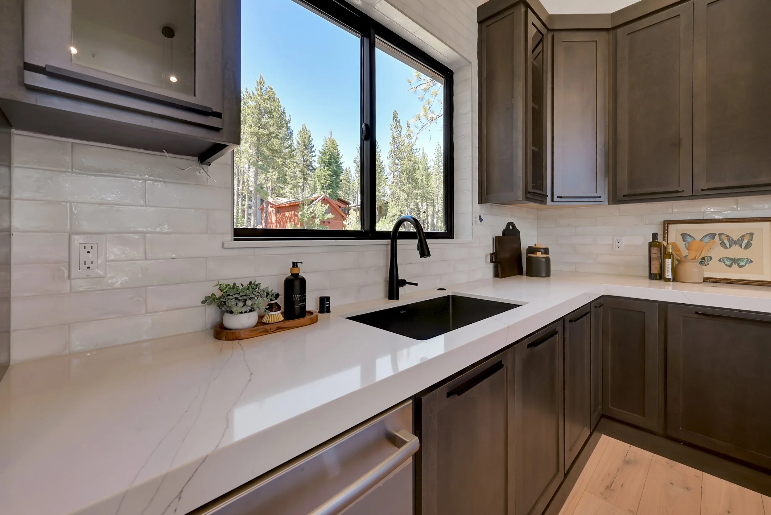 “A bright and stylish kitchen corner featuring sleek dark cabinetry, white quartz countertops, and a modern black sink with matte black fixtures. The glossy white subway tile backsplash adds texture and elegance, while the large window fills the space with natural light and offers serene forest views. Thoughtful décor and clean lines create a warm, contemporary mountain feel.