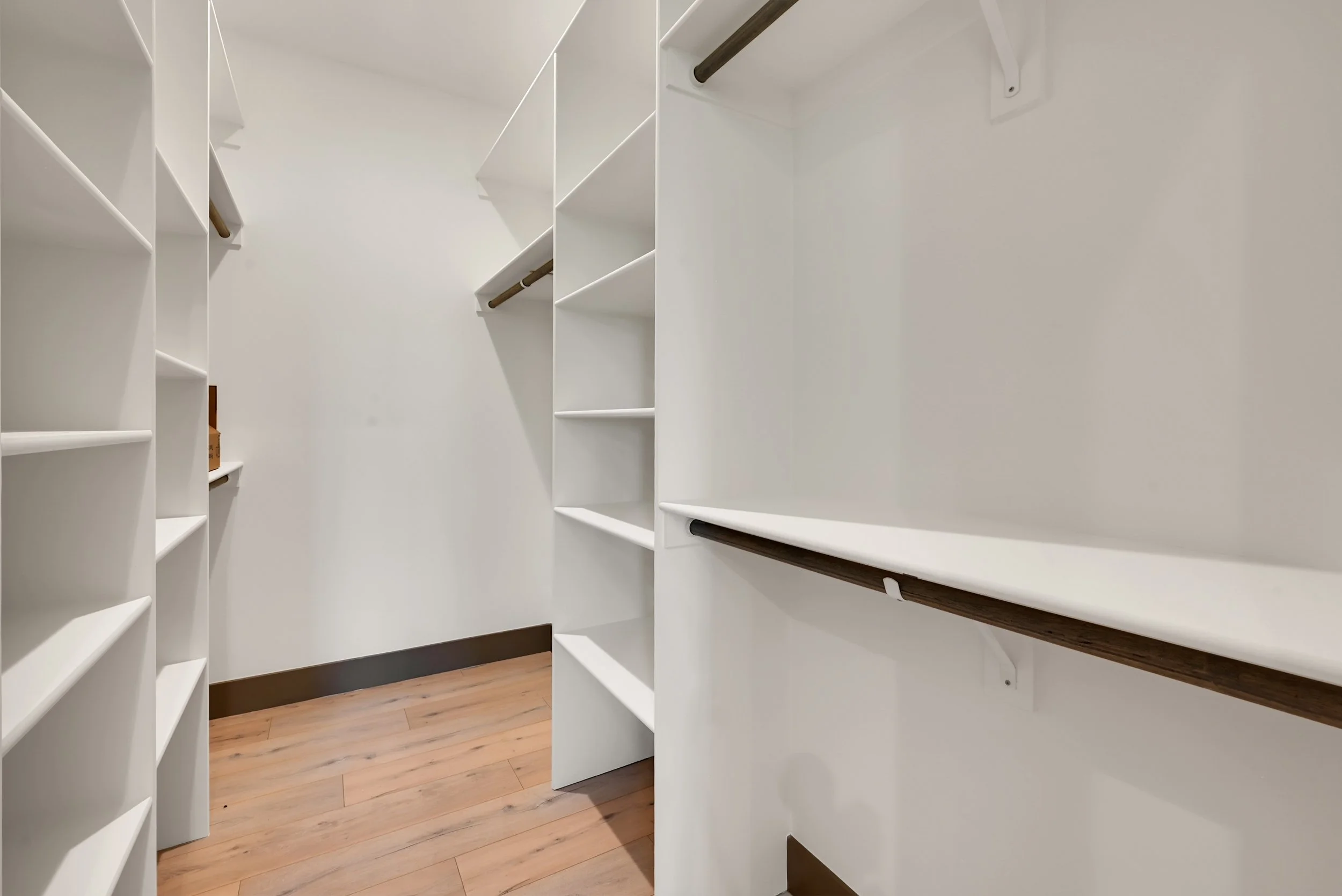 A spacious walk-in closet with built-in shelving, double hanging rods, and warm wood flooring. Clean white finishes and open storage create an organized, modern feel with plenty of room for clothes and accessories.