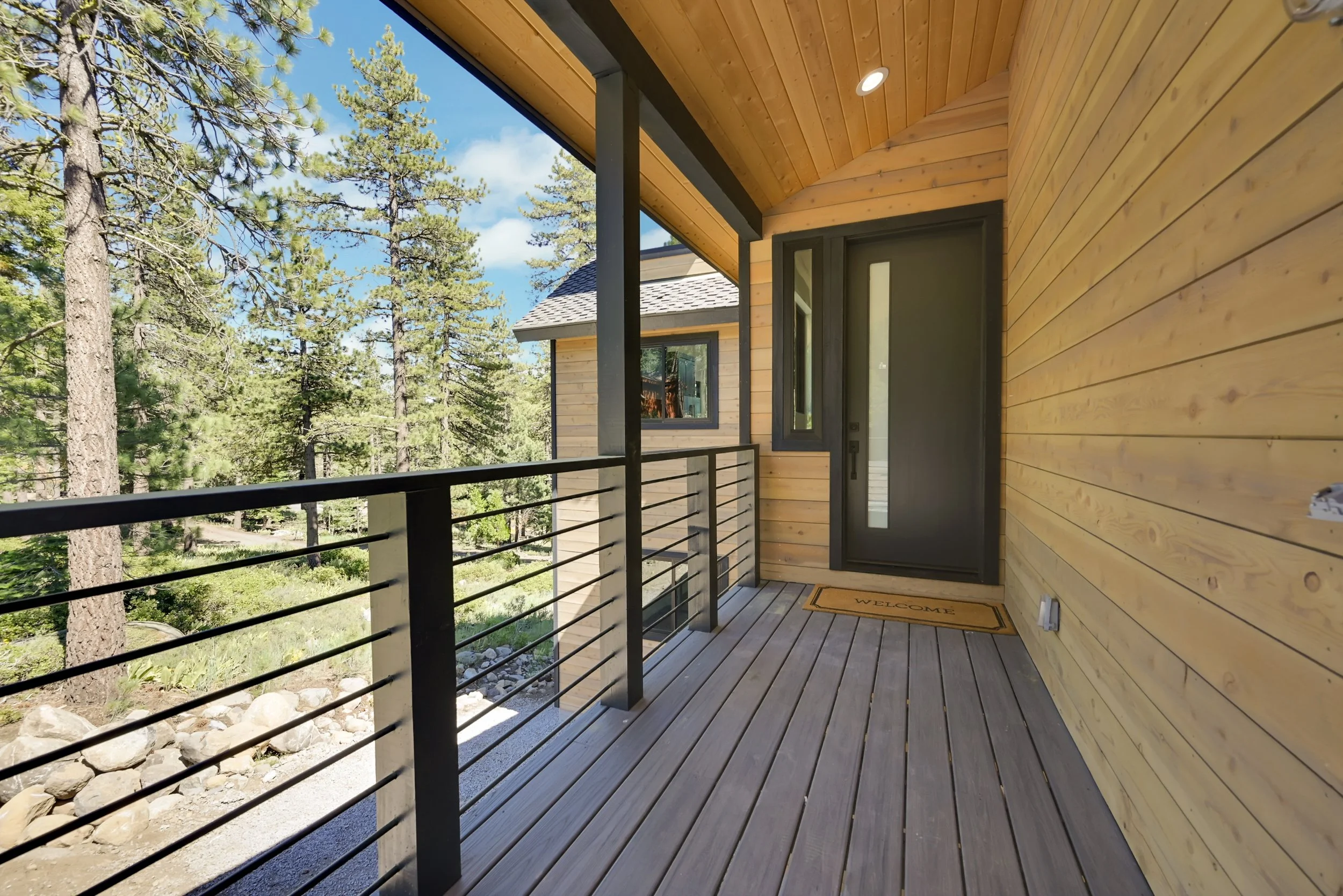 A welcoming covered entryway with warm natural wood siding and modern black accents. The front porch features clean horizontal railing lines and overlooks tall pine trees and forest greenery. Soft natural light and a sleek black front door create a calm, modern mountain feel as you step into the home.