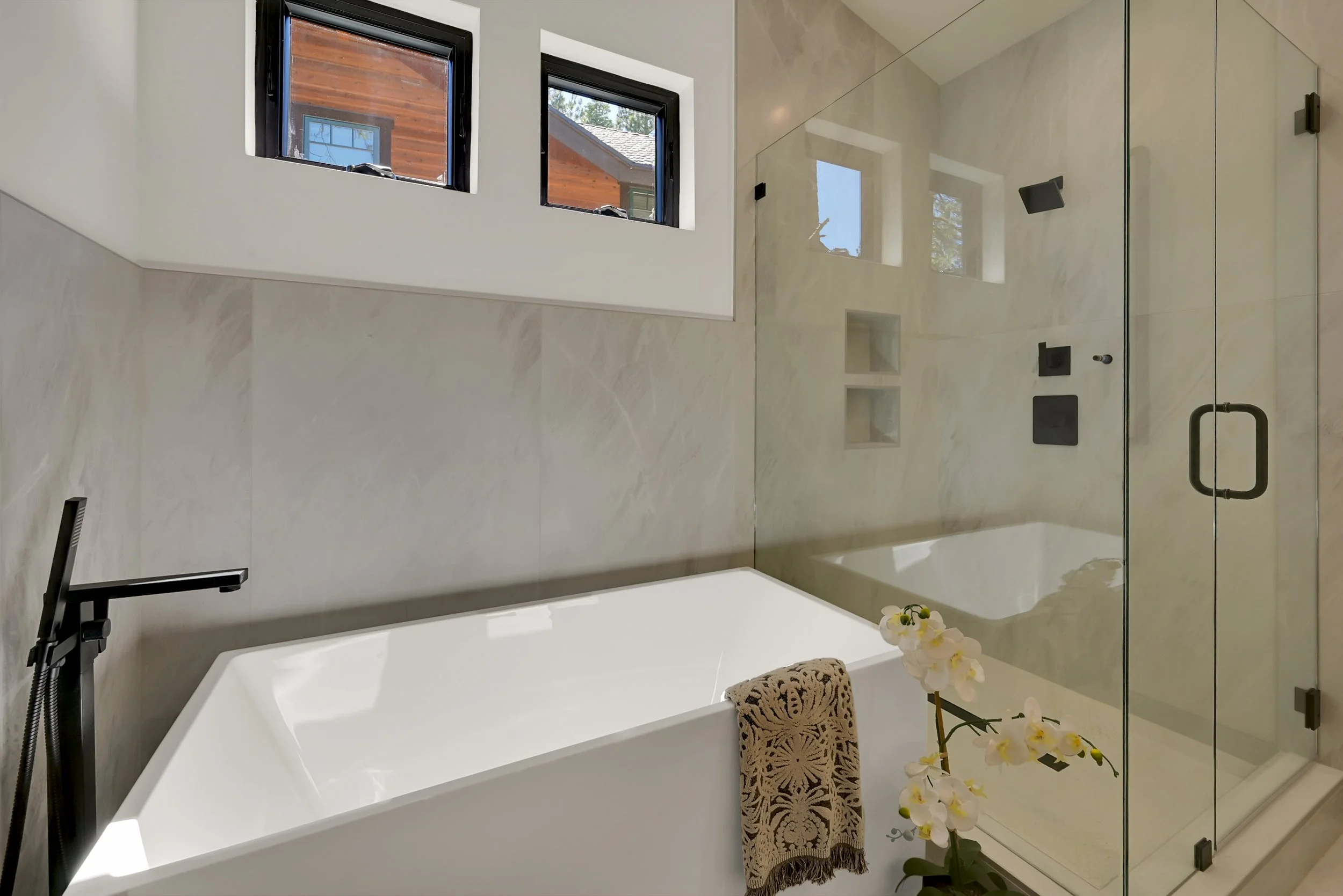 A serene spa-style bathroom featuring a modern freestanding soaking tub, floor-to-ceiling porcelain tile walls, sleek black fixtures, and a glass-enclosed shower. Two high windows bring in soft natural light while maintaining privacy, creating a calm and luxurious atmosphere.