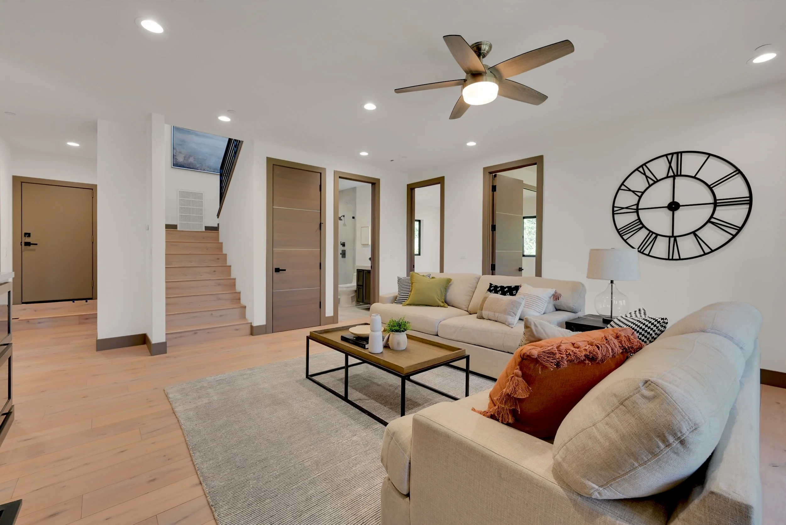 Warm and inviting lower-level living area featuring neutral tones, modern wood finishes, and soft natural light. The open layout seamlessly connects the lounge to the hallway and staircase, creating a cozy yet spacious atmosphere—perfect for relaxing or hosting guests.