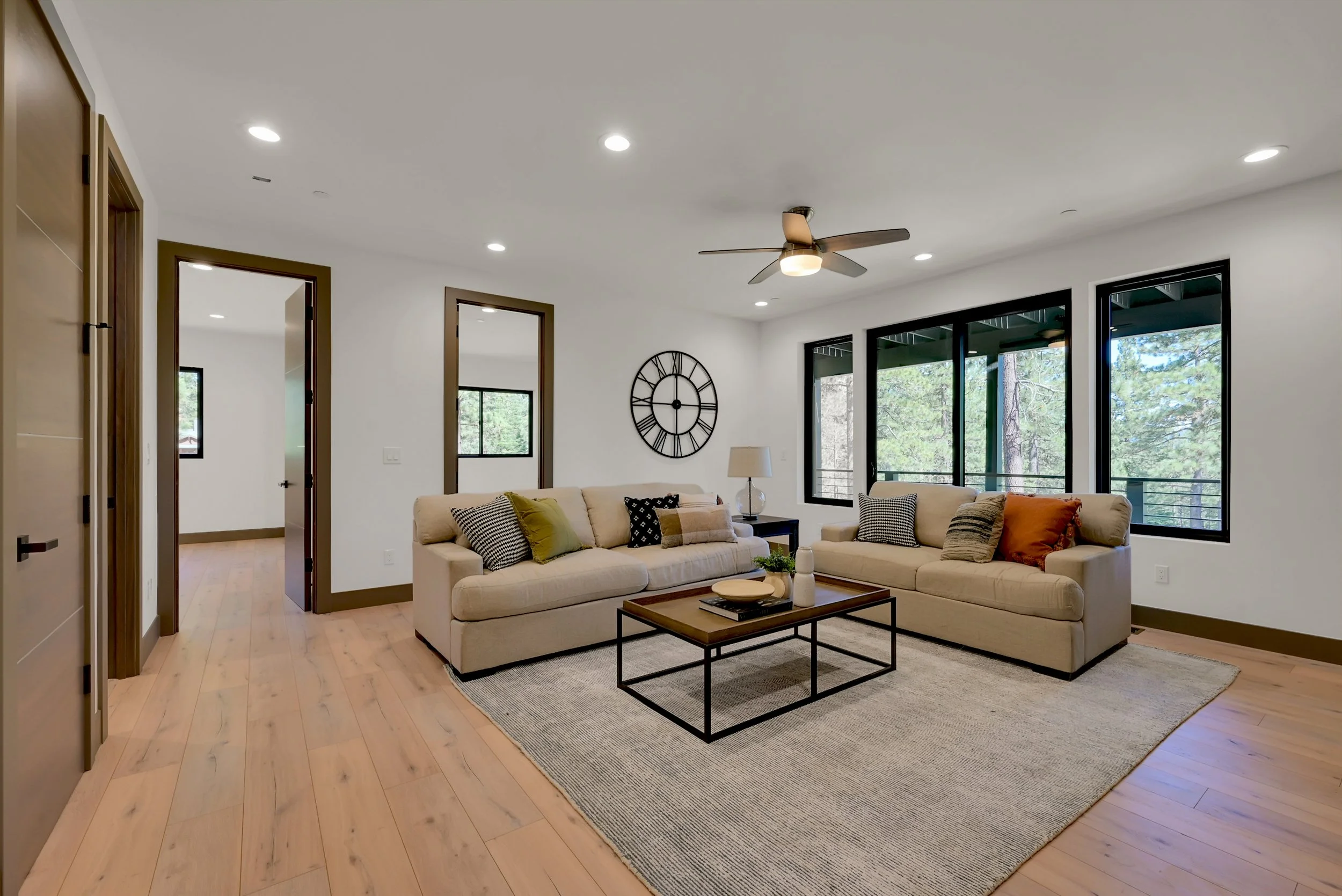 A bright and inviting living area featuring large windows framing serene forest views. The open layout, warm wood floors, and modern finishes create a comfortable space perfect for relaxing or entertaining.
