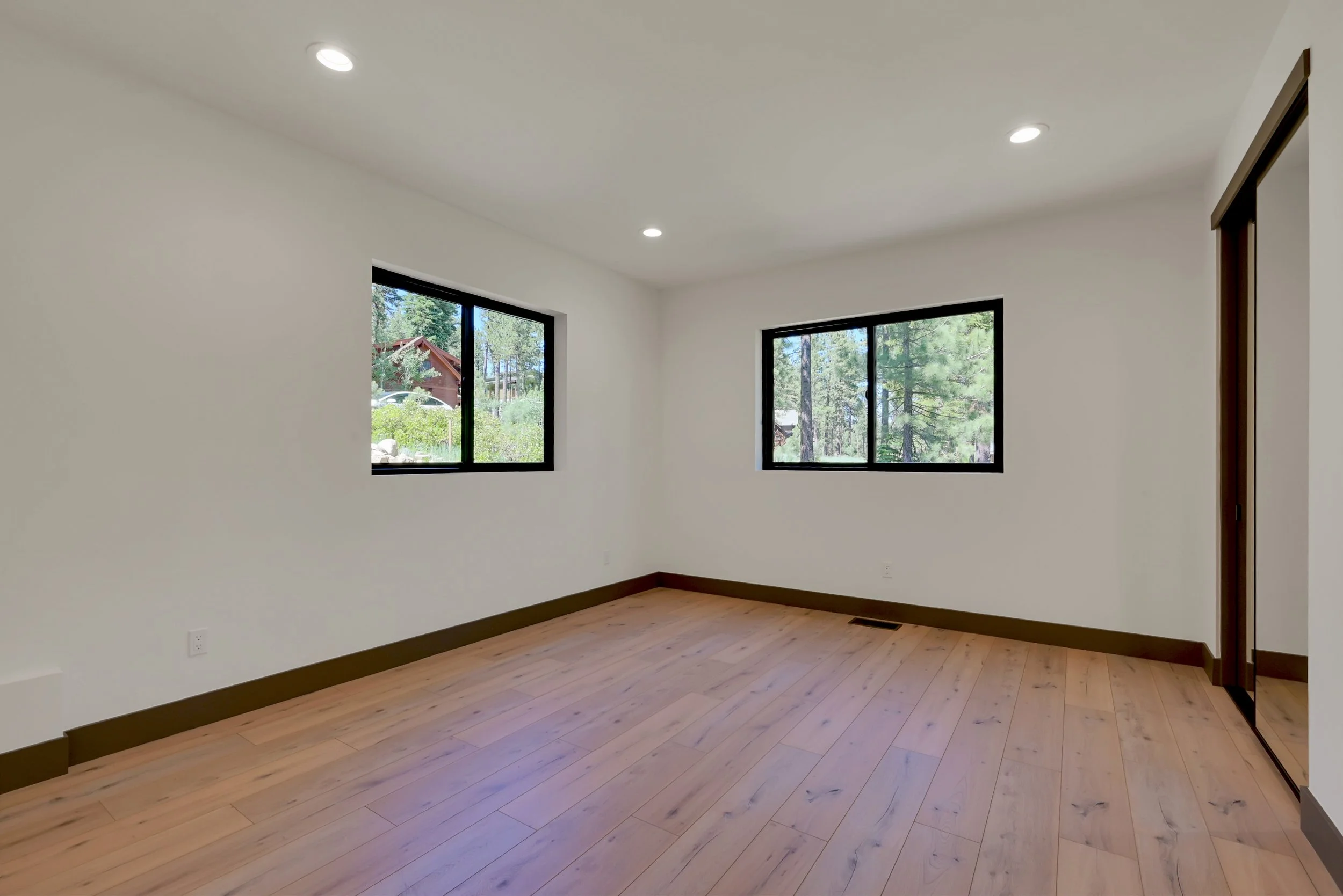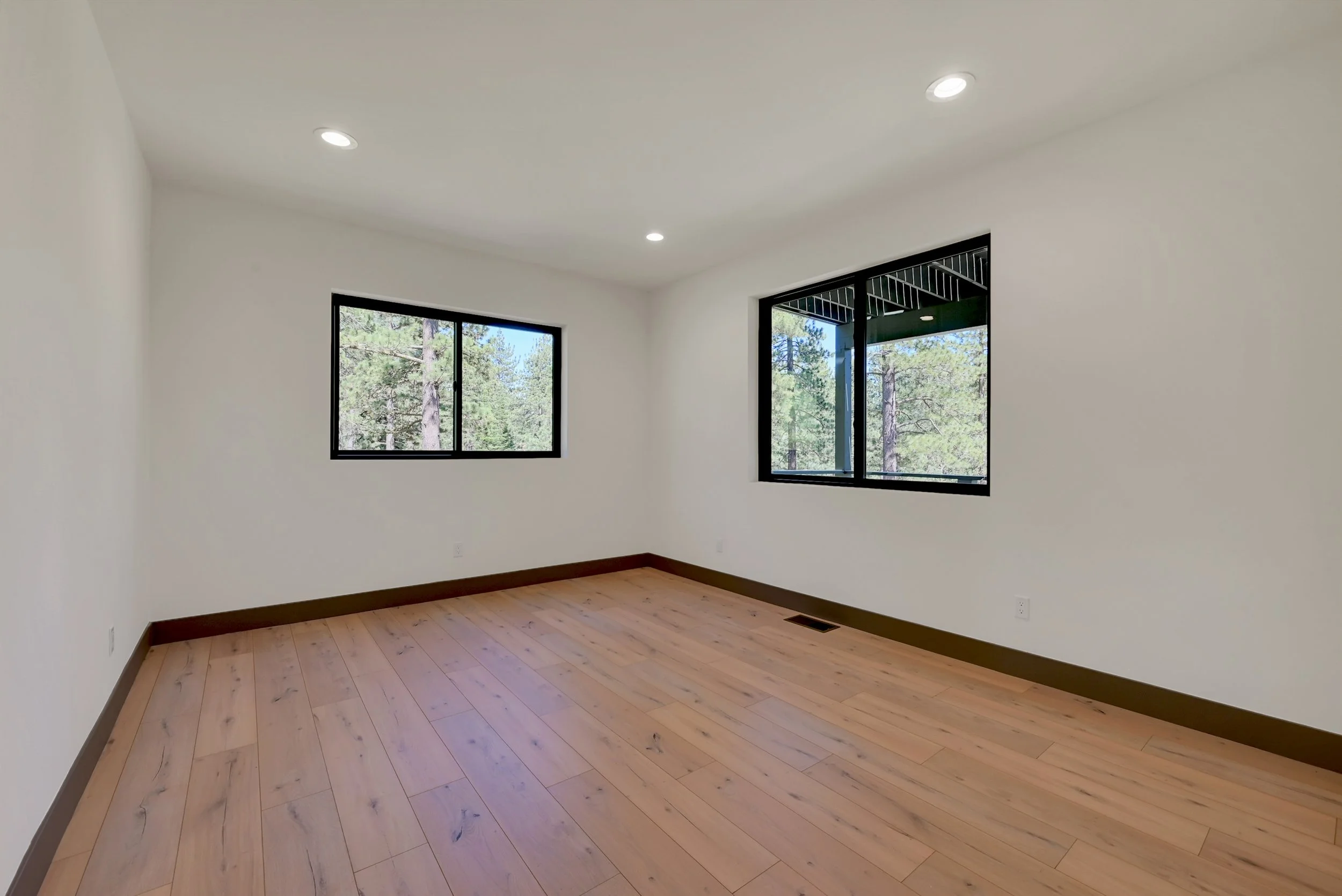A bright and spacious room with wide-plank hardwood floors, clean white walls, and two large windows framing peaceful forest views. The simple layout and natural light make the space feel calm, open, and versatile.