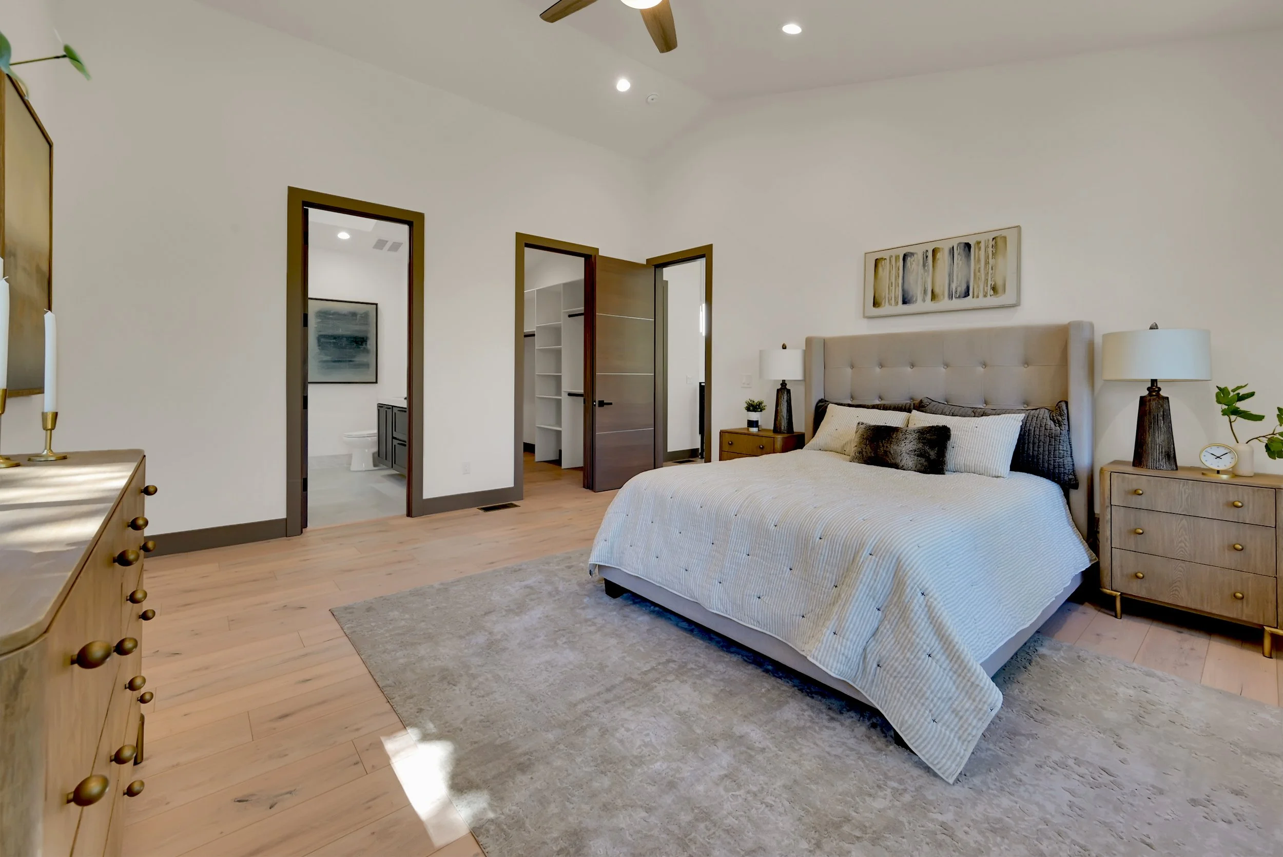 A spacious and elegant primary bedroom with a soft neutral palette and warm wide-plank wood flooring. The room features a cozy tufted headboard, matching nightstands, and serene décor. Two doorways lead to a luxurious en-suite bathroom and a large walk-in closet, adding comfort and functionality. Bright natural light fills the room, creating a calm and inviting retreat.