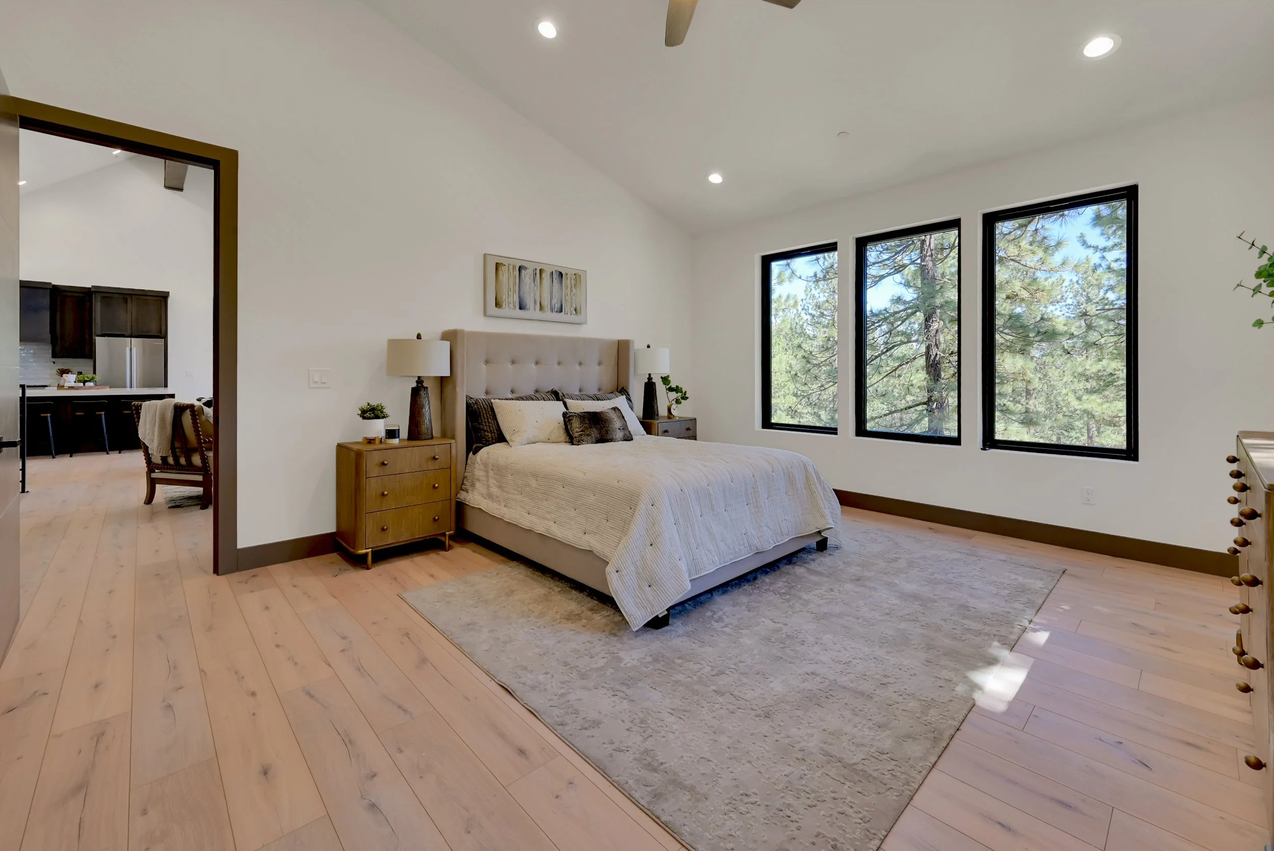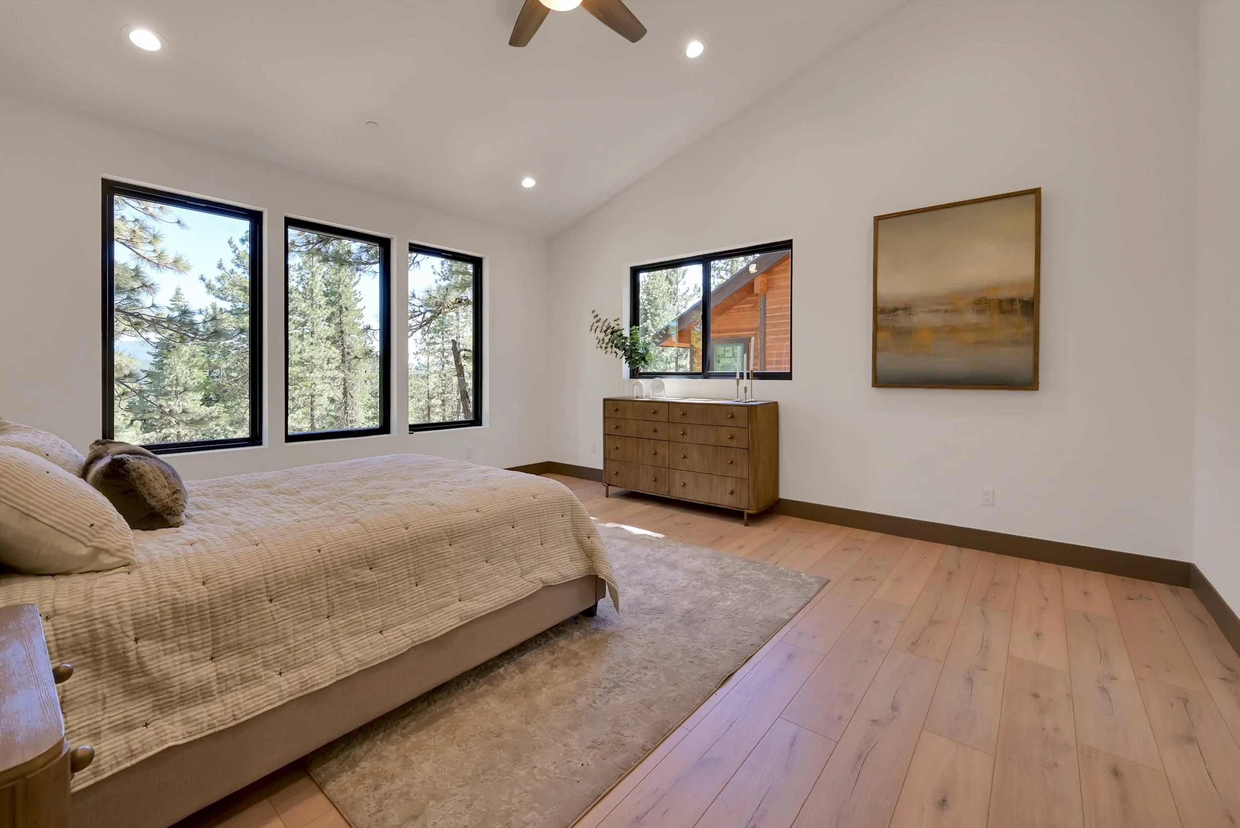 “Bright and spacious bedroom featuring a wall of large picture windows that frame the surrounding pine trees. Clean modern lines, warm wood floors, and abundant natural light create a calm, airy atmosphere — perfect as a primary suite or a relaxing guest room.”