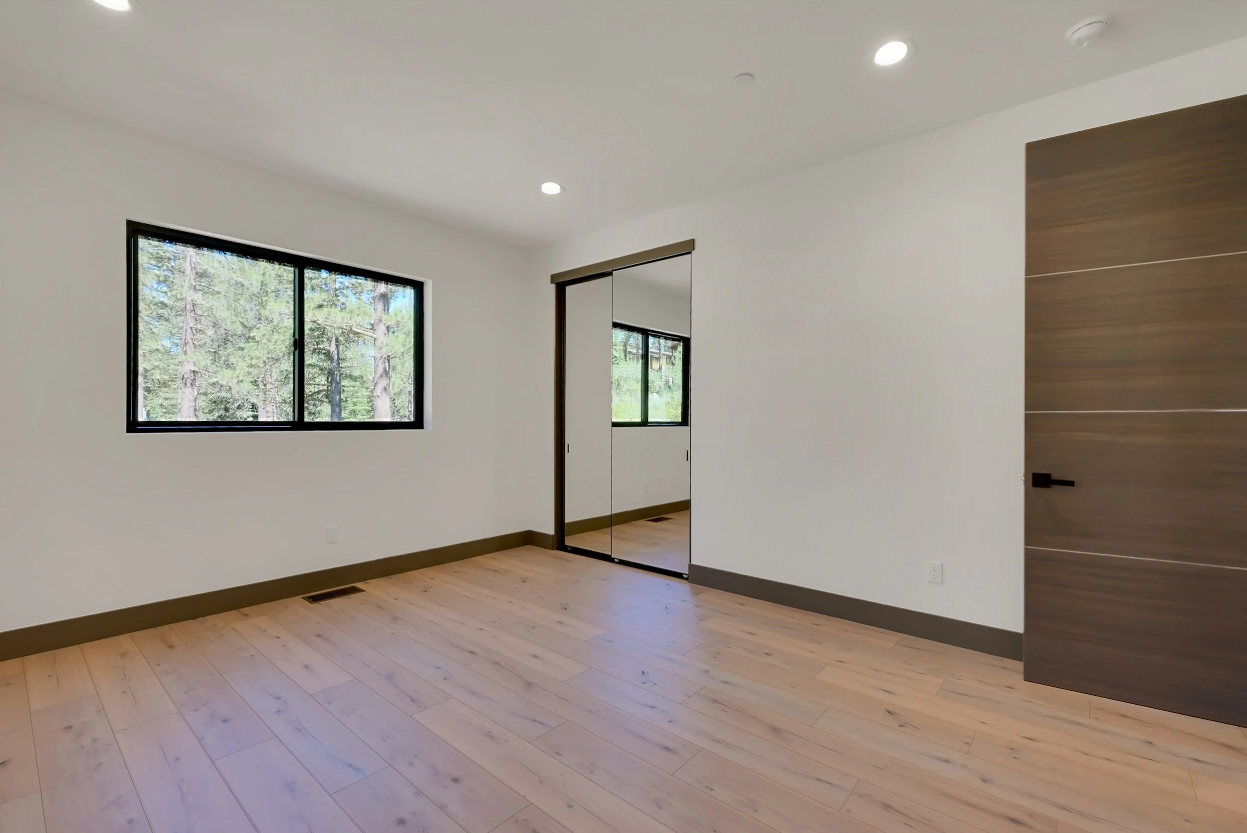 A bright secondary bedroom featuring wide-plank hardwood floors, a large picture window with serene forest views, and a mirrored closet that expands the sense of space. Clean lines and neutral finishes create a peaceful, versatile room ready for any use.