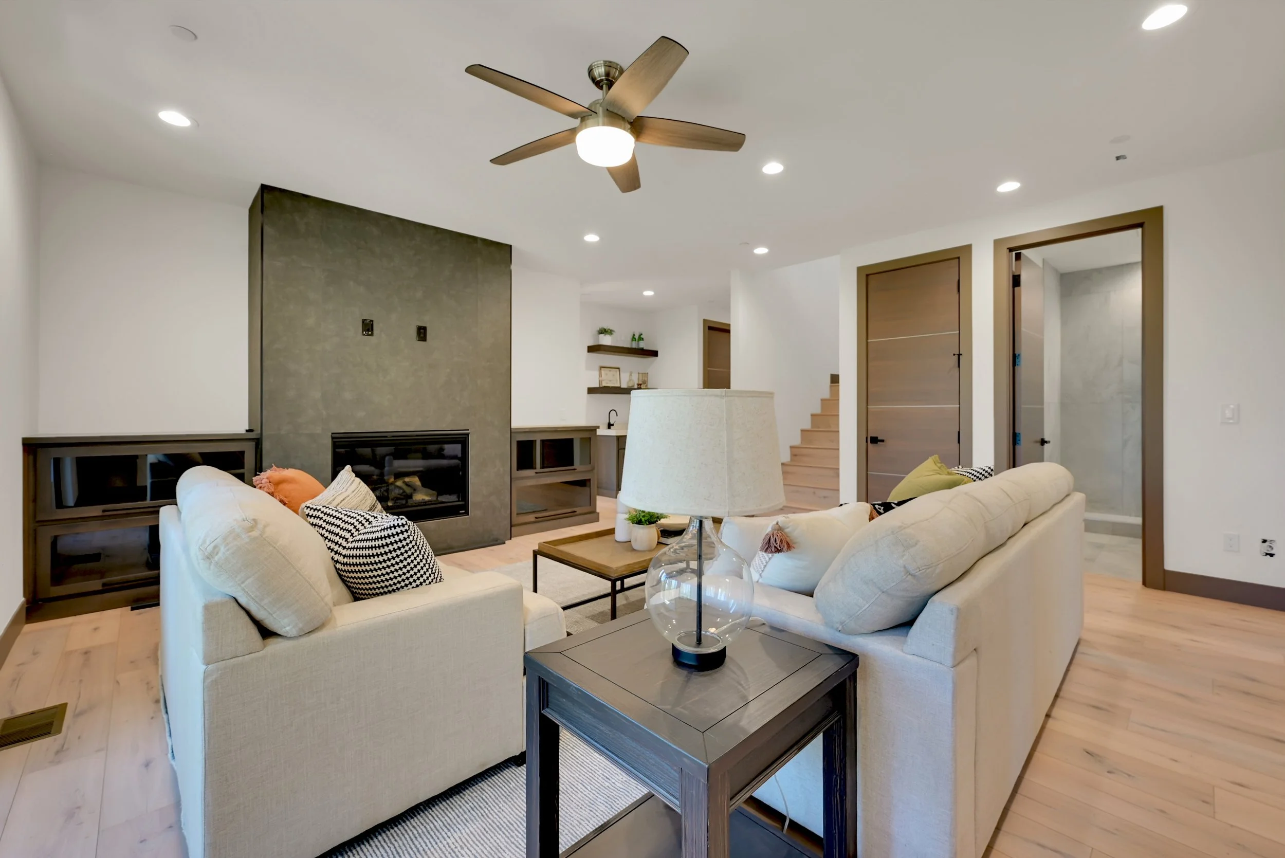 Bright and cozy living space featuring a modern fireplace wall, warm wood flooring, and an open layout that connects seamlessly to the kitchen and hallway. The room’s neutral palette and soft furnishings create an inviting atmosphere, perfect for relaxing or entertaining.