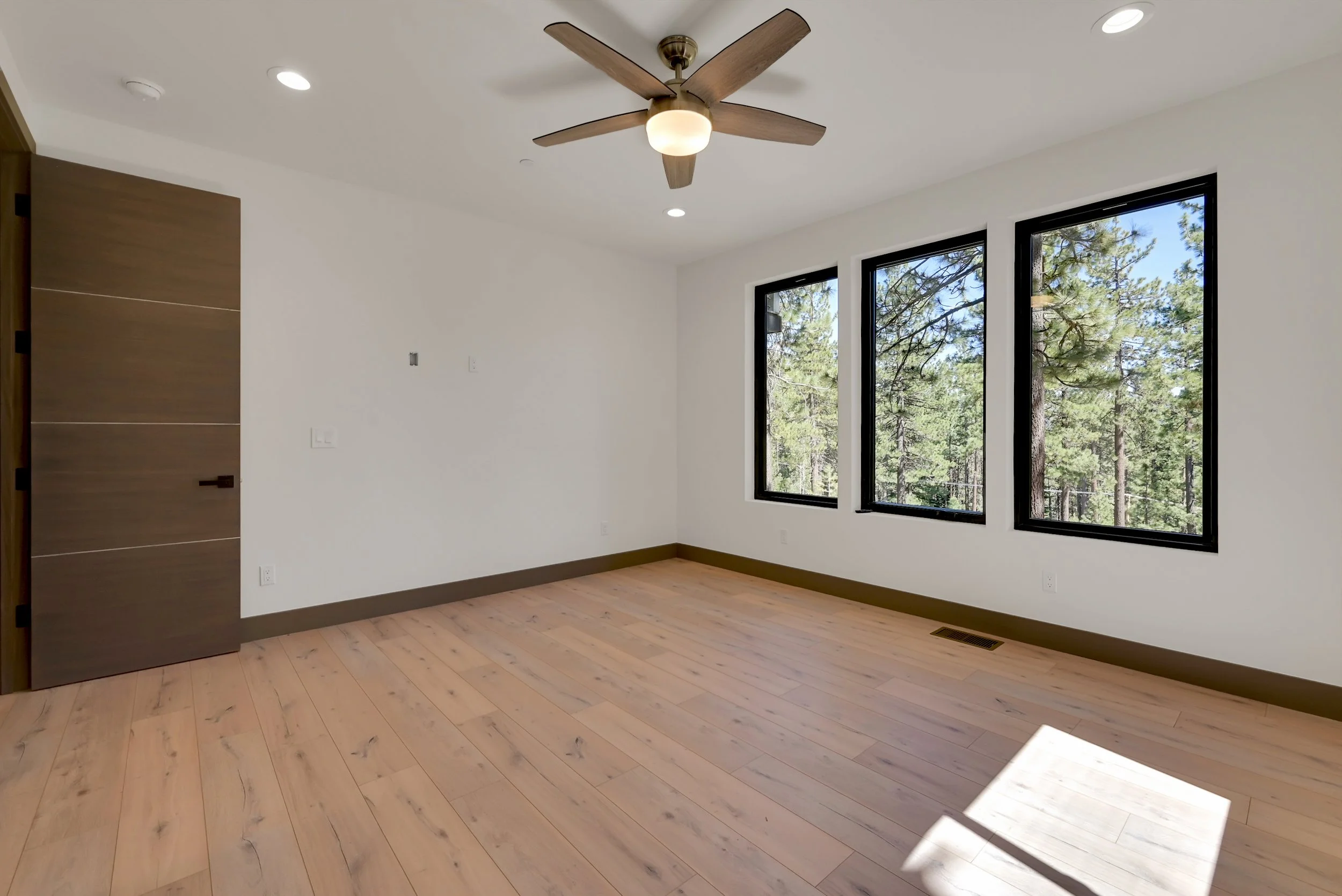 A bright and spacious bedroom with large windows framing serene forest views. Clean lines, warm hardwood floors, and neutral walls create a calm, modern atmosphere—perfect for a guest room, office, or cozy retreat.