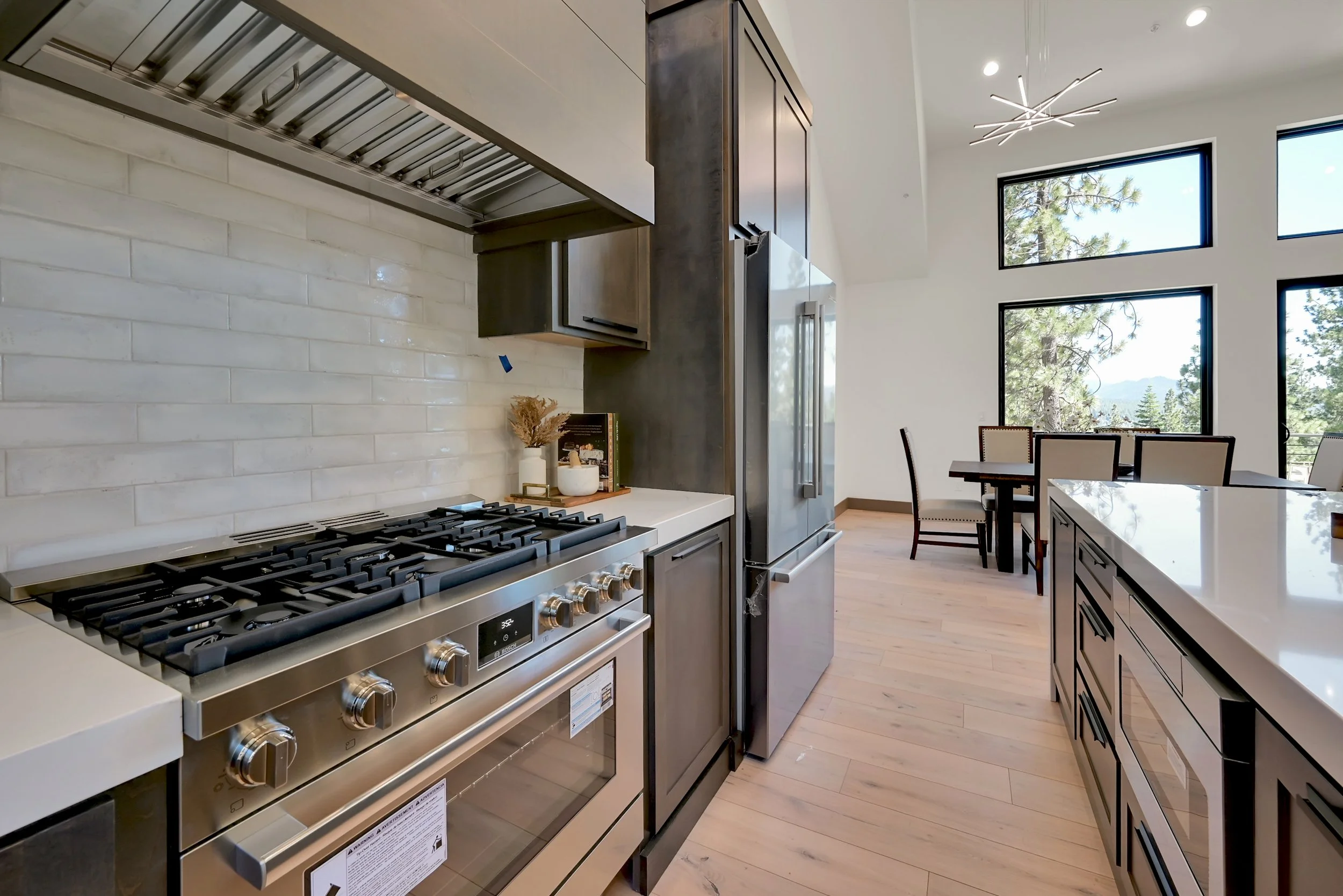 A high-end kitchen featuring a stainless steel gas range, sleek dark cabinetry, and a glossy subway tile backsplash. The warm wood flooring flows seamlessly into the dining area, where large picture windows frame peaceful forest and mountain views. Clean lines, premium appliances, and abundant natural light create a modern and inviting cooking space.
