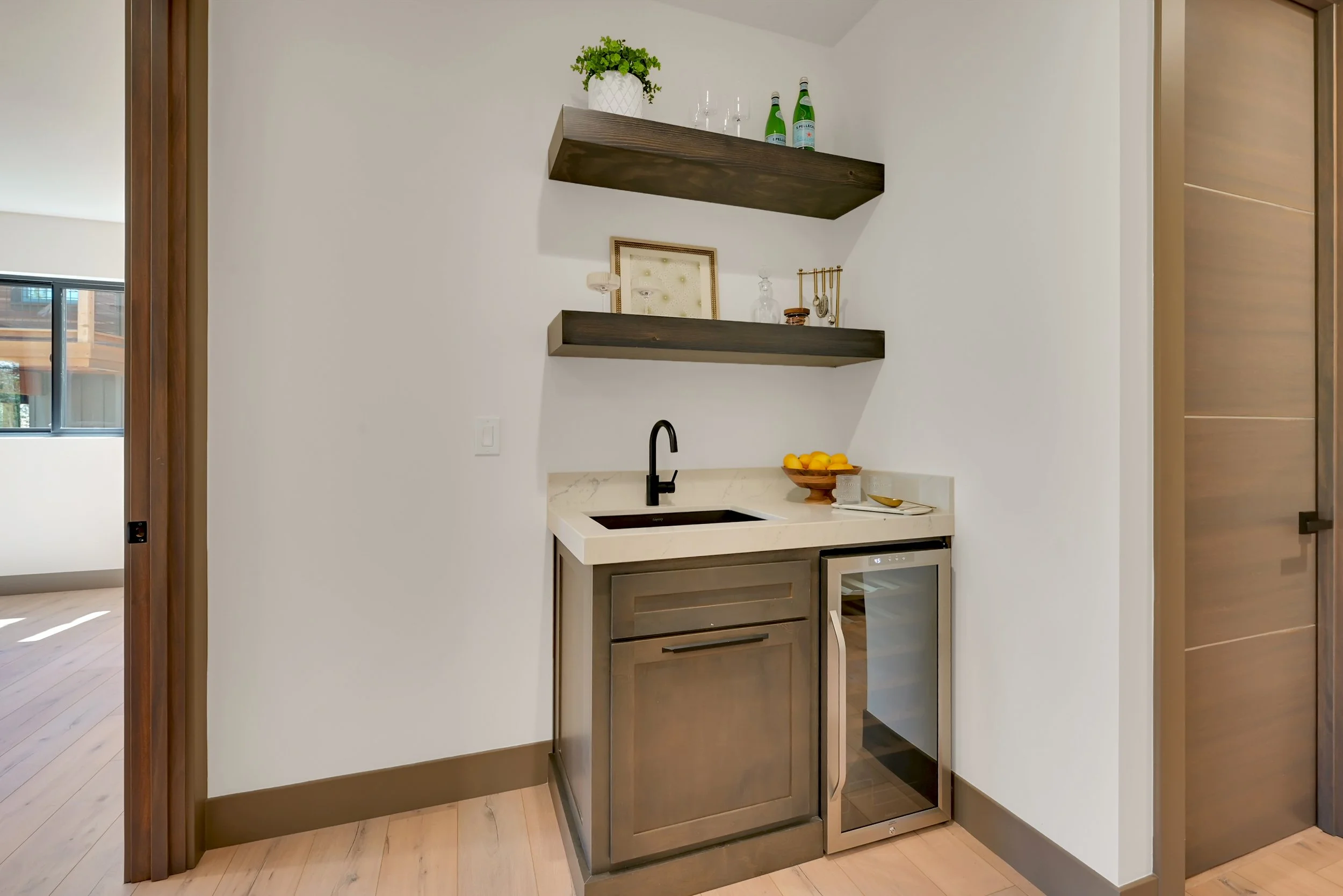 A stylish wet bar with a quartz countertop, dark wood cabinetry, and a built-in beverage fridge. Floating shelves add a modern touch and offer space for decor, glassware, and essentials, creating a perfect spot for entertaining.