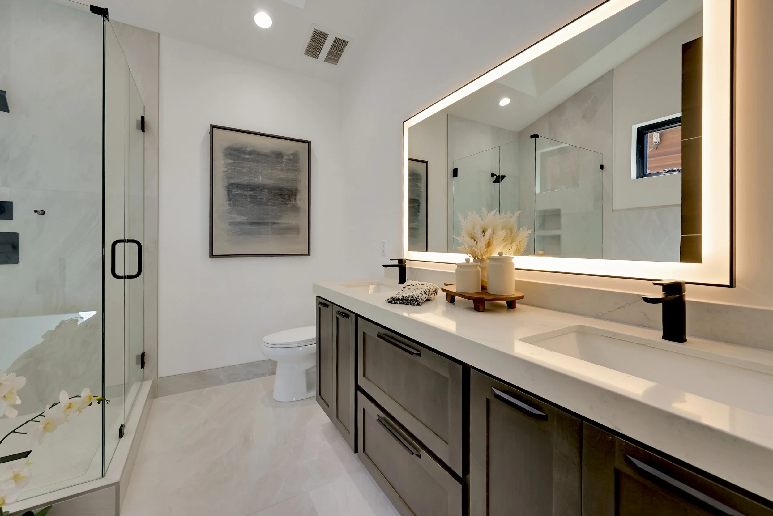 A luxurious primary bathroom featuring a spacious glass-enclosed shower, double vanity with sleek quartz countertops, and an oversized backlit mirror that adds a warm, modern glow. Matte black fixtures and elegant cabinetry create a refined, contemporary look, while soft neutral tile and minimalist décor keep the space bright and calming. A perfect blend of elegance and relaxation.