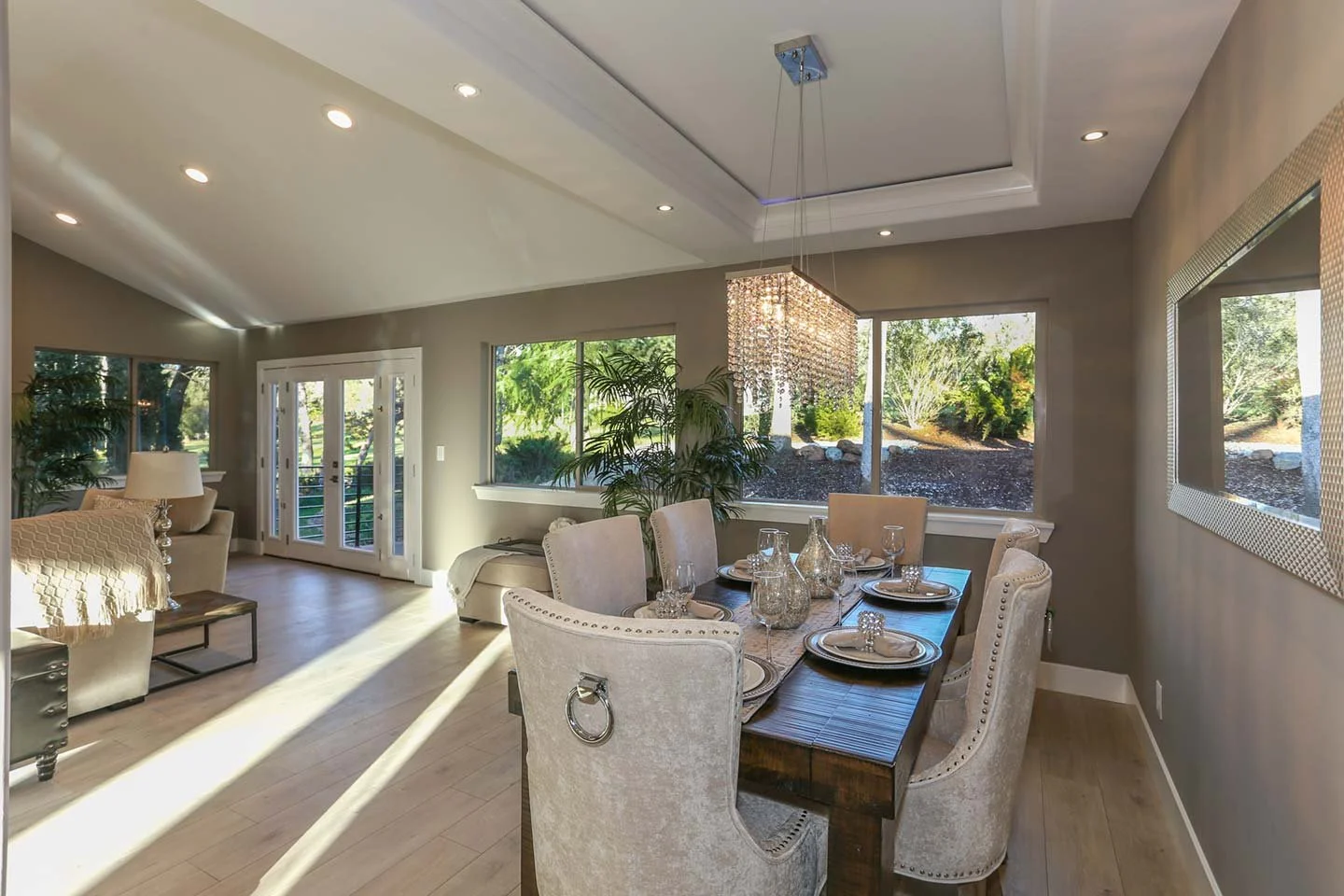 Host with ease in this elegant dining space featuring a statement chandelier, designer wet bar, and expansive windows framing serene outdoor views.