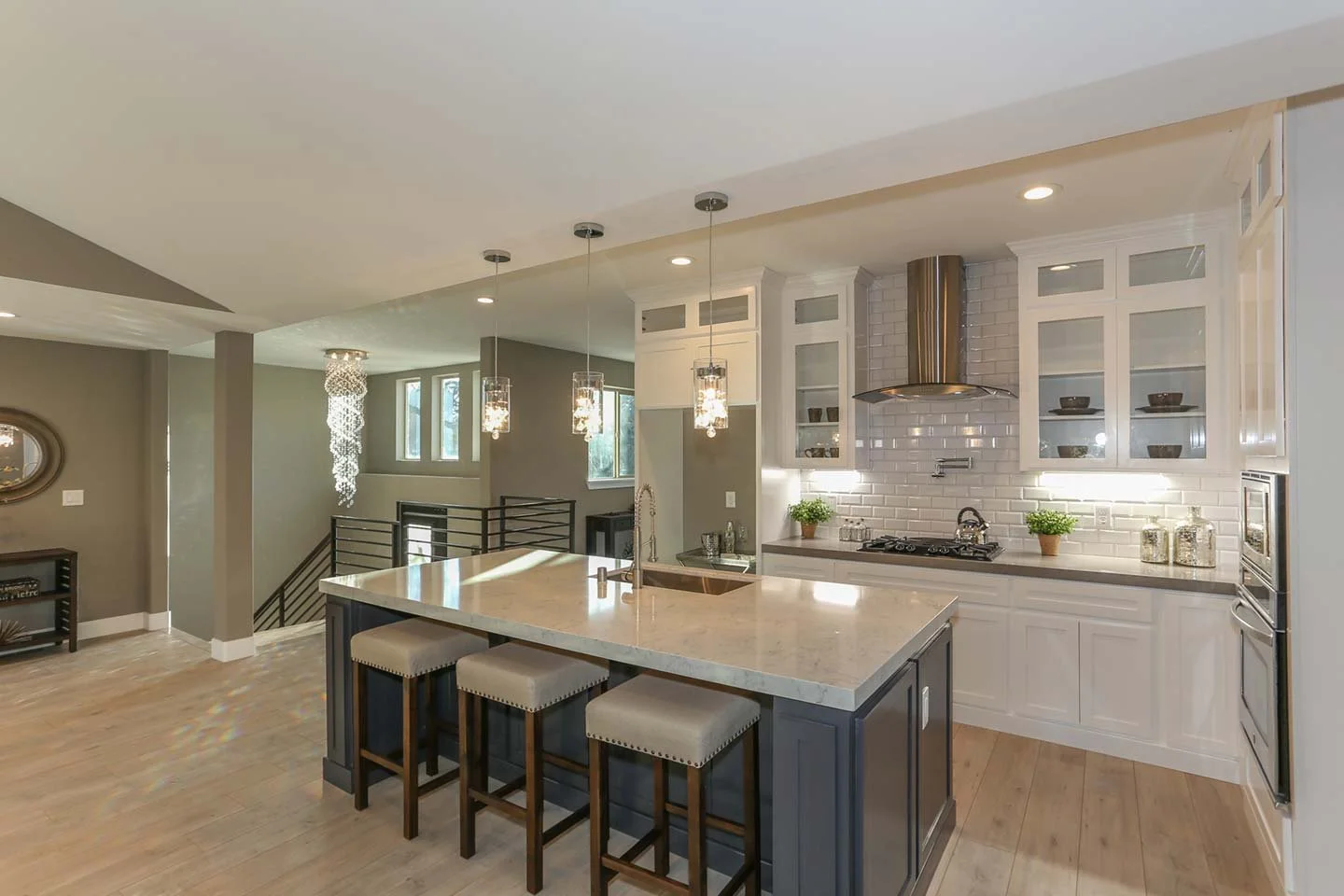 A bright, open kitchen with polished finishes and layered lighting—designed for both style and everyday living.