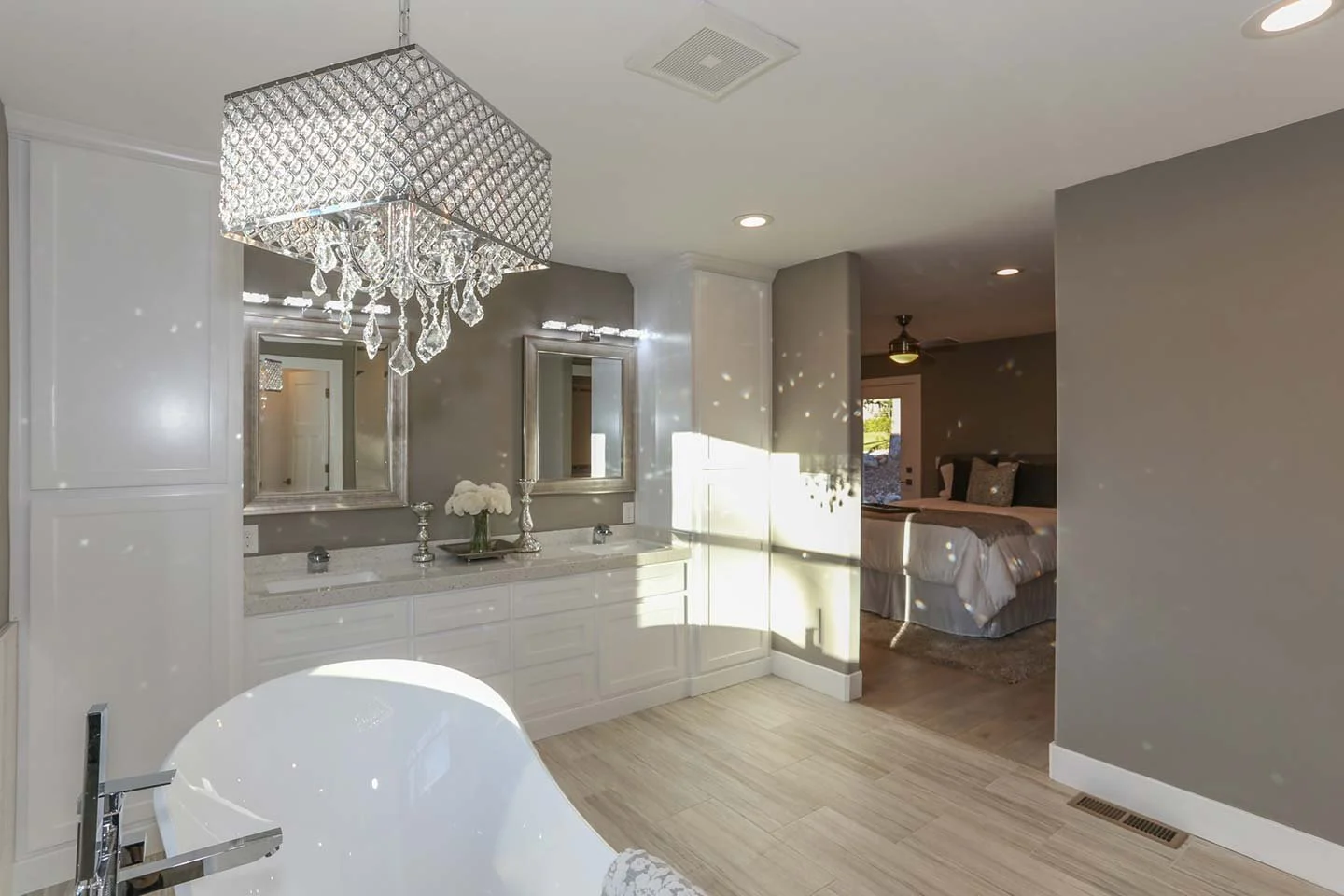 Luxurious primary suite where the spa-like bathroom flows seamlessly into the bedroom, illuminated by a crystal chandelier and warm natural light.