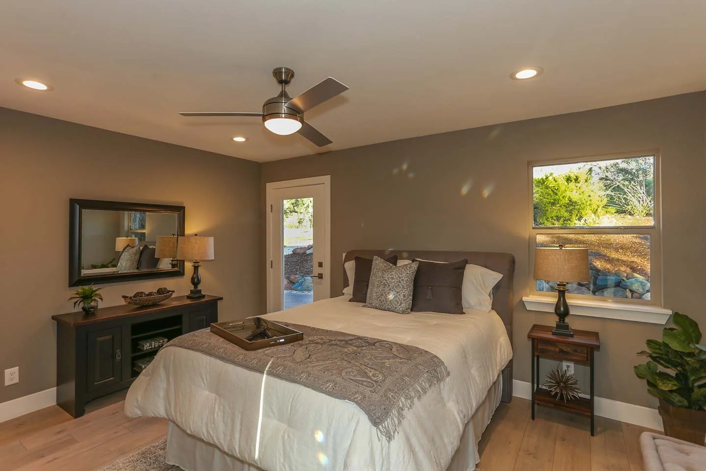 Inviting primary bedroom with direct access to a spa-inspired ensuite bath, featuring warm neutral tones and soft natural light for a serene retreat.