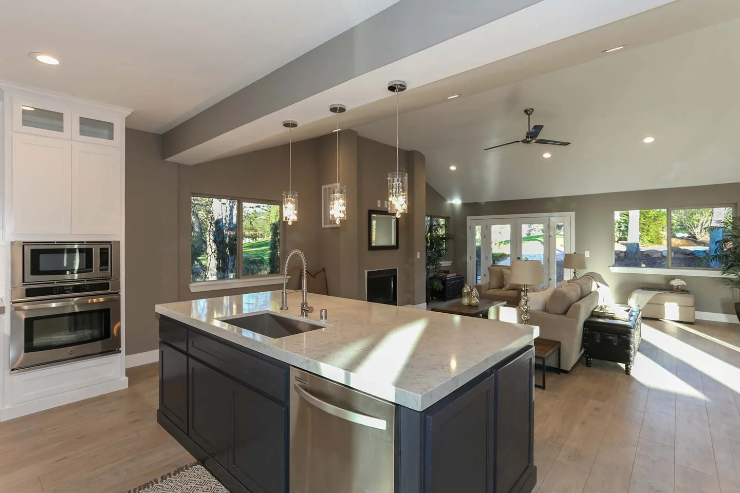Large windows and full-glass French doors bring the outdoors in, connecting the living space to a newly finished patio—perfect for entertaining.