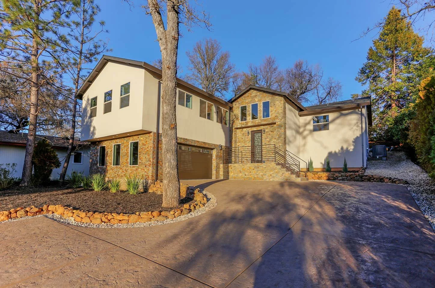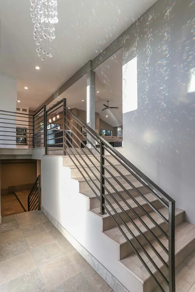 Open stair design with sleek metal railings connects multiple levels, emphasizing the home's modern lines and natural light.