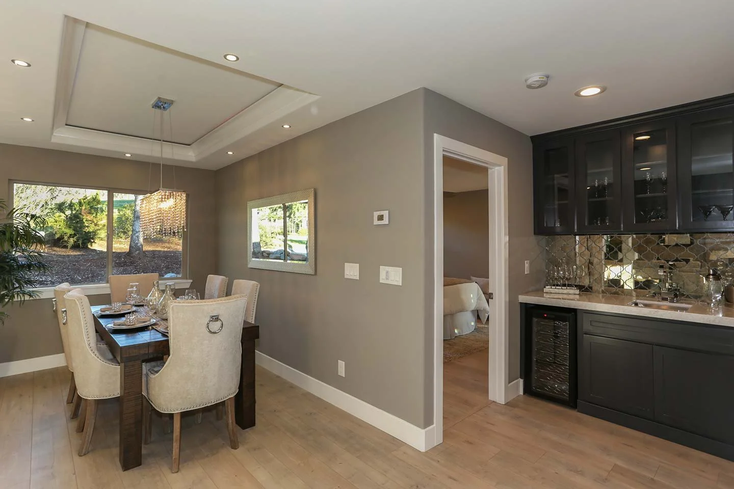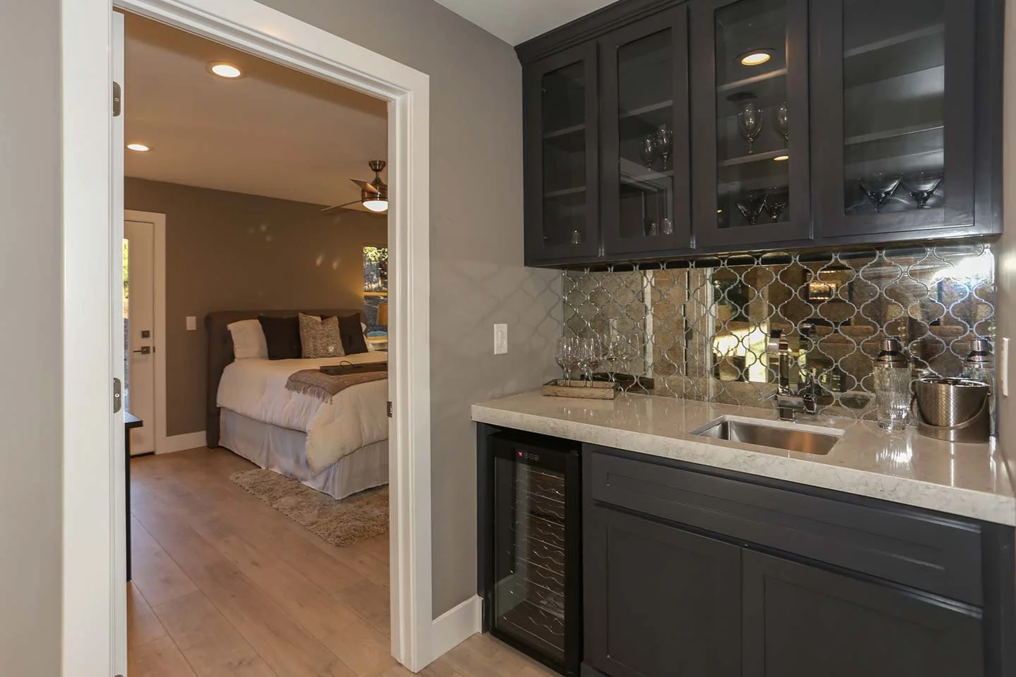Sophisticated wet bar with mirrored tile backsplash and glass cabinetry, perfectly situated between the dining area and primary suite for effortless entertaining.