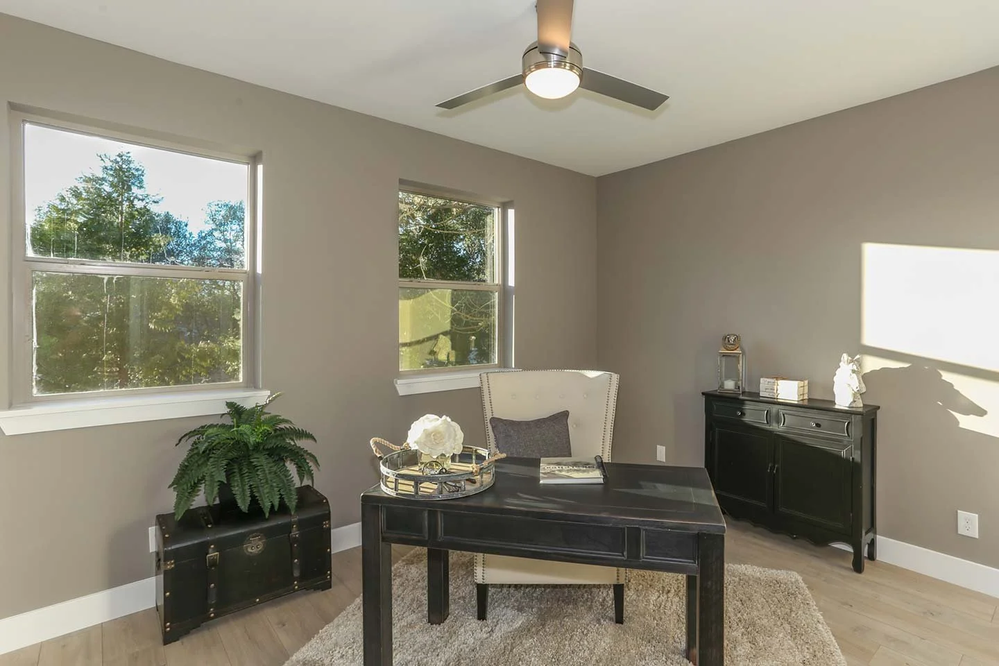 Calm and refined home office filled with natural light, offering a focused workspace with serene garden views and timeless design details.