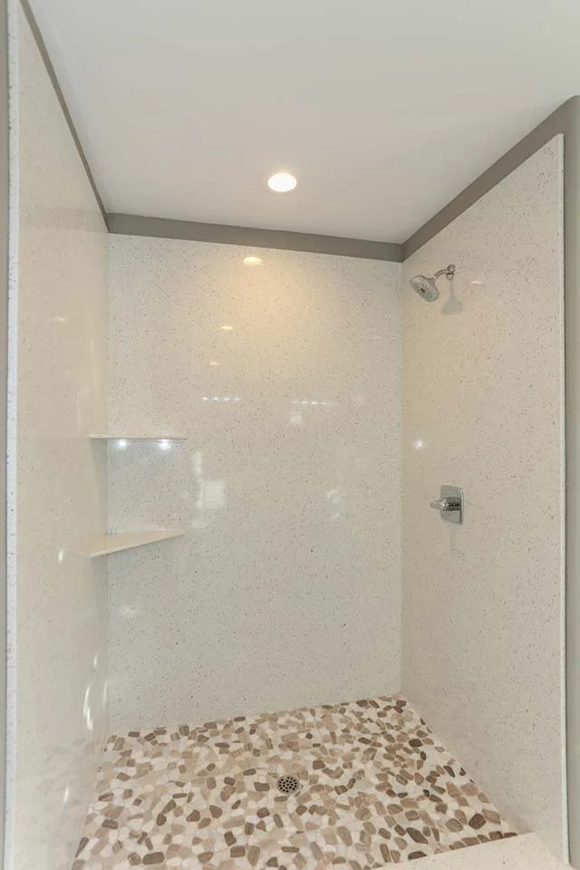 Bright, minimal shower design with a pebble floor detail and clean quartz finishes for timeless appeal.