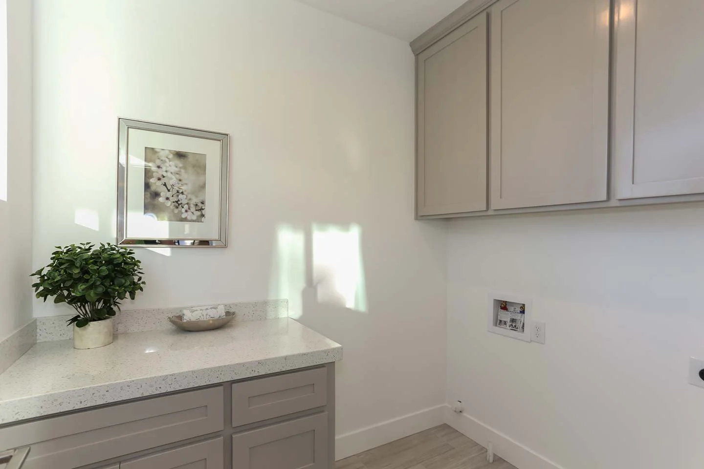 Streamlined design with custom cabinetry and neutral textures creates a calm, functional corner for daily living.