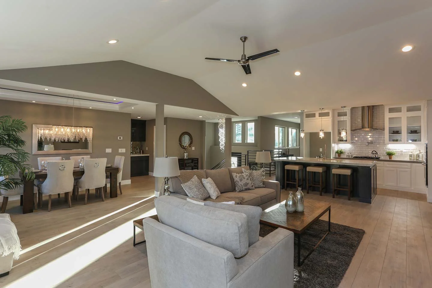 Open-concept living area seamlessly connecting kitchen, dining, and lounge spaces—highlighted by natural light, layered textures, and warm neutral tones.