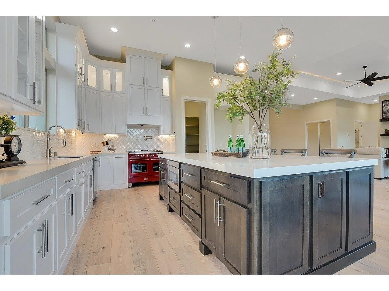 A bright and spacious chef’s kitchen featuring custom white cabinetry, a striking red professional range, and an oversized island with contrasting dark wood. High ceilings, elegant pendant lighting, and premium finishes create a refined, modern culinary space.
