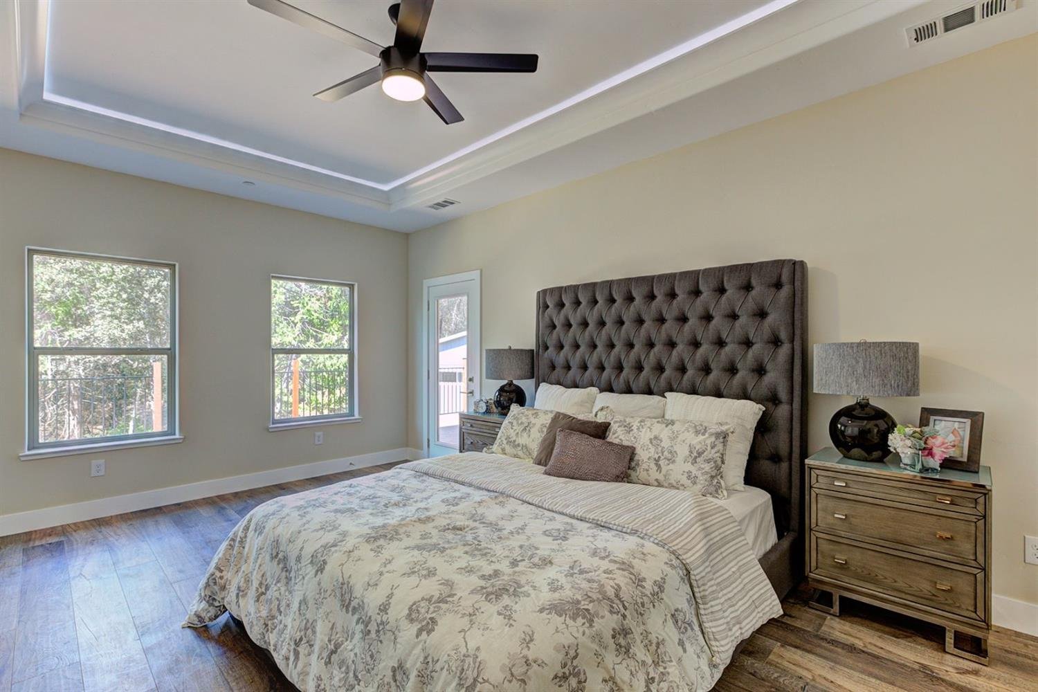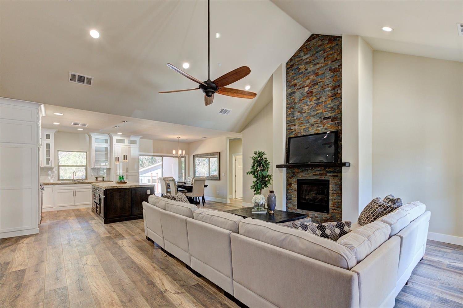 Custom single-story home featuring a modern exterior with stone accents, clean roof lines, and large windows that frame the surrounding landscape. Designed and built with a focus on timeless aesthetics and high-quality materials.