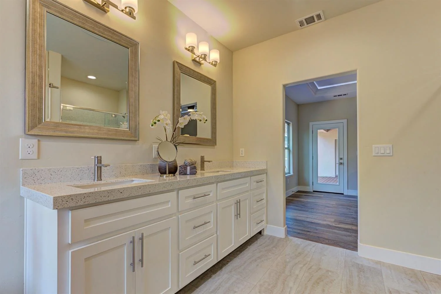 Bright primary bathroom featuring a long dual-sink vanity with quartz countertops, framed mirrors, and modern lighting. Soft neutral tones, clean lines, and a wide entryway create a calm, elegant feel that connects seamlessly to the bedroom.