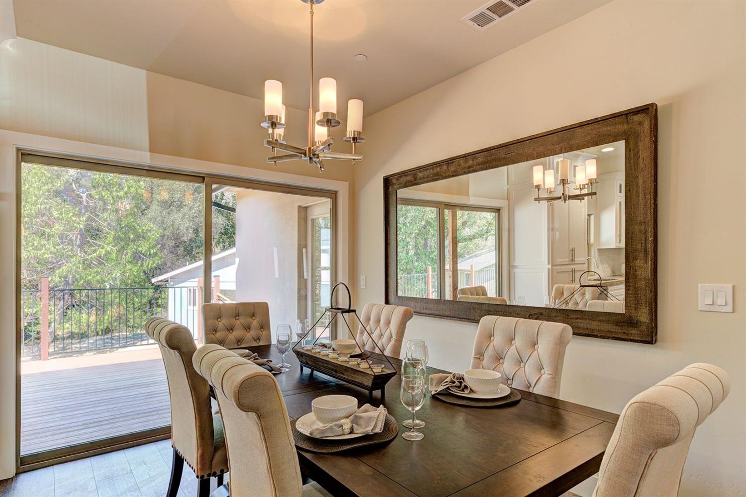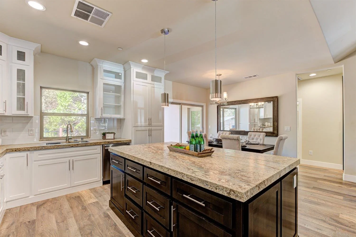 Bright kitchen and dining area featuring custom white cabinetry, a large stone island, and floor-to-ceiling windows bringing in natural light and views of the surrounding trees.