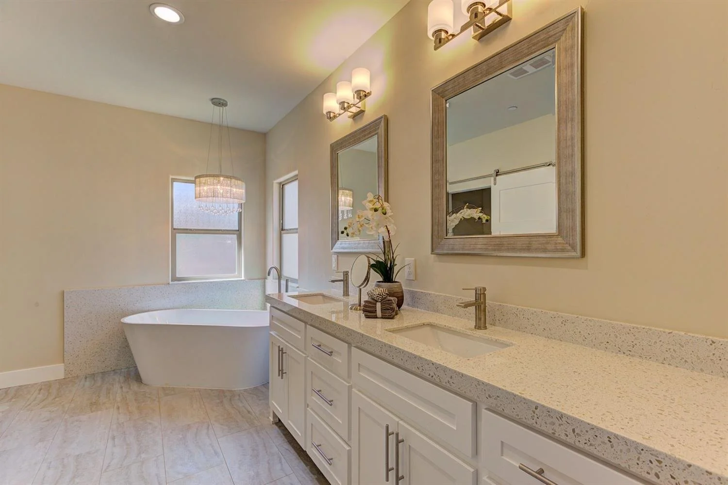 Bright and calming primary bathroom featuring a freestanding soaking tub, double vanity with quartz counters, and warm designer lighting. A clean, elegant space with a spa-like feel
