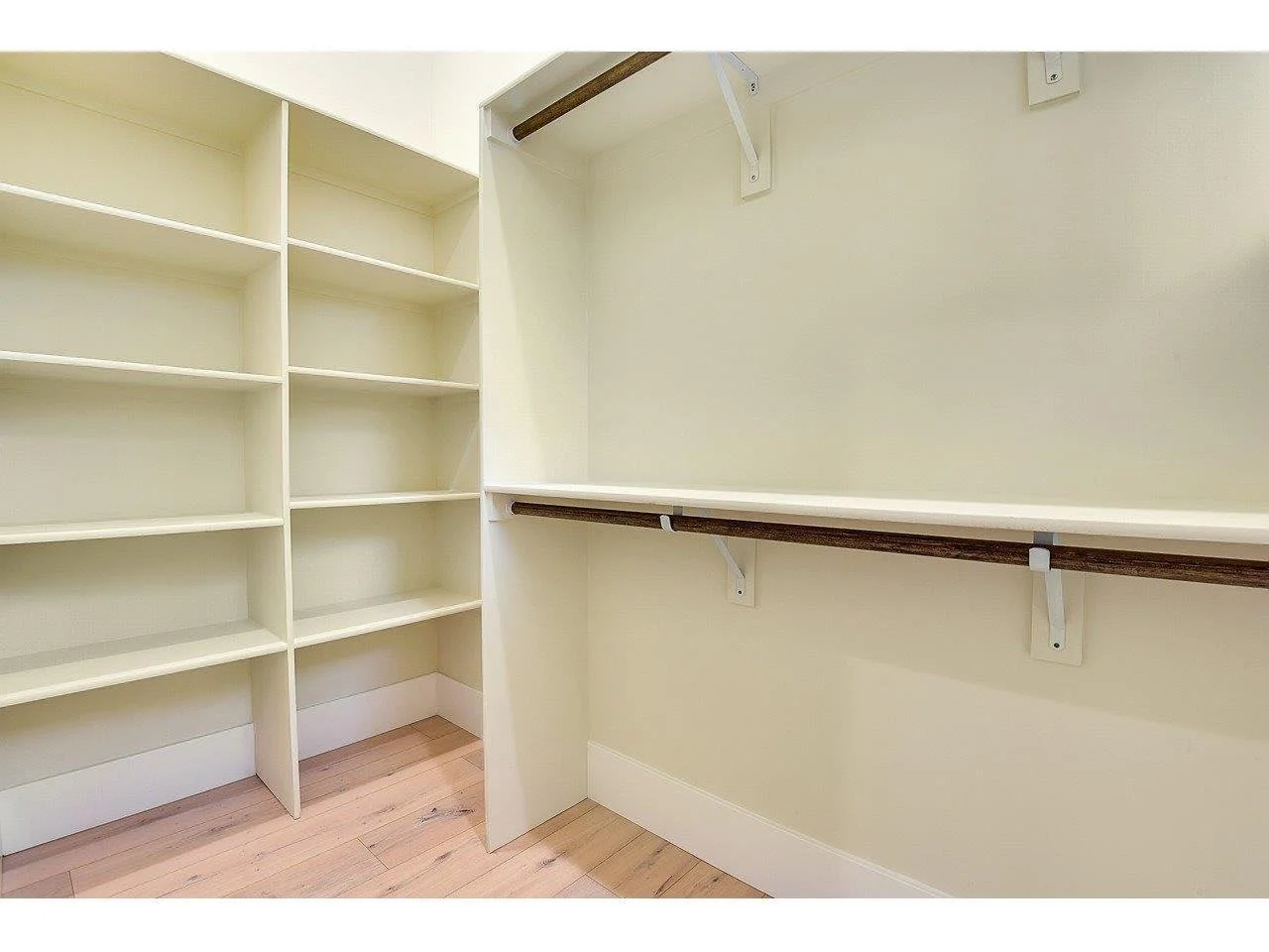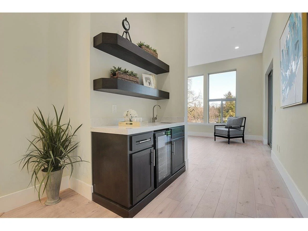 A stylish built-in wet bar with floating shelves and a beverage fridge adds a functional luxury touch to the primary suite. Natural light from the large windows enhances the clean, modern design of this space.