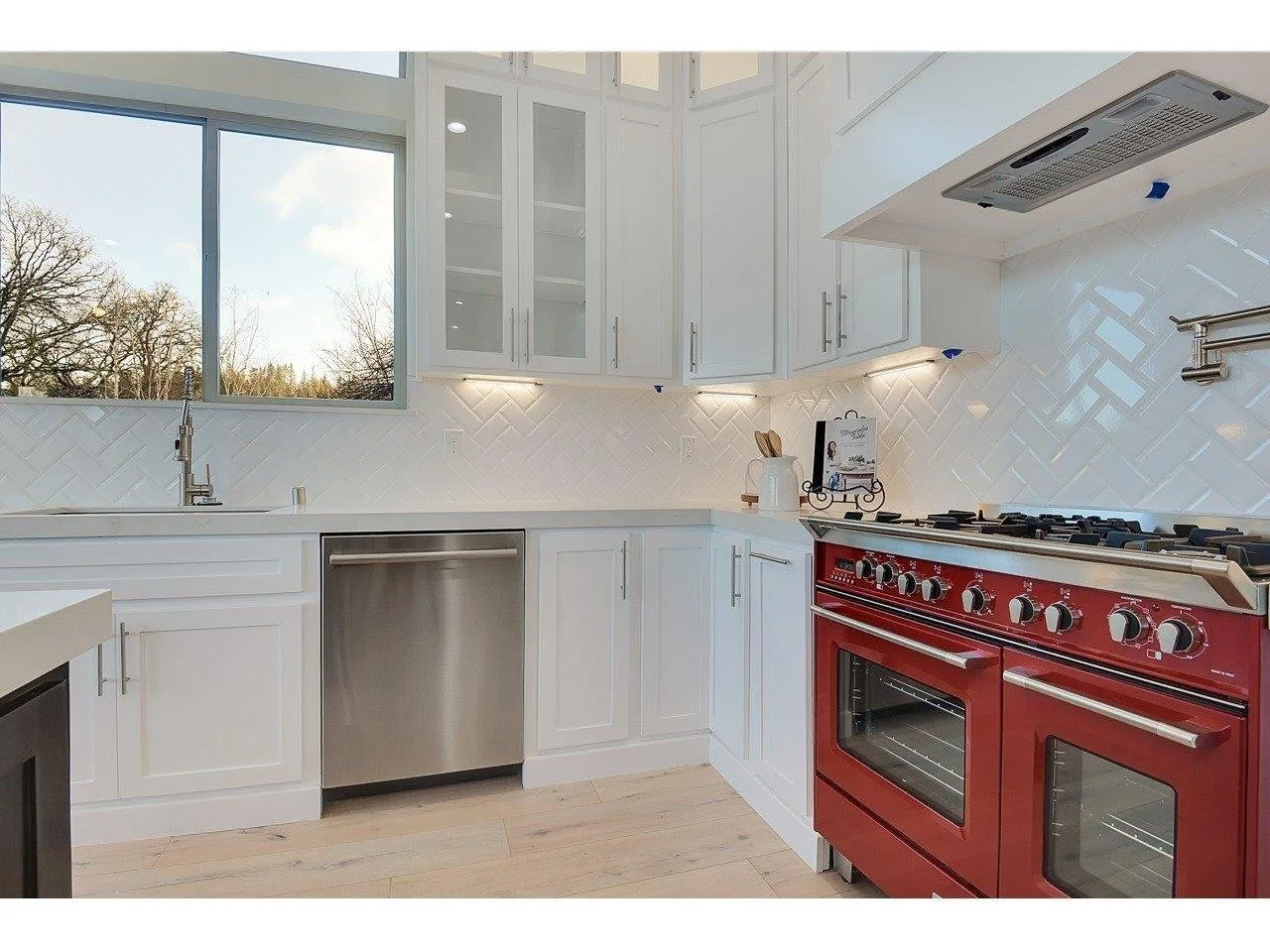 A bright and modern kitchen featuring custom white cabinetry, a herringbone tile backsplash, and premium stainless-steel appliances. The bold red professional range becomes the focal point, adding character and contrast to the clean, elegant design.