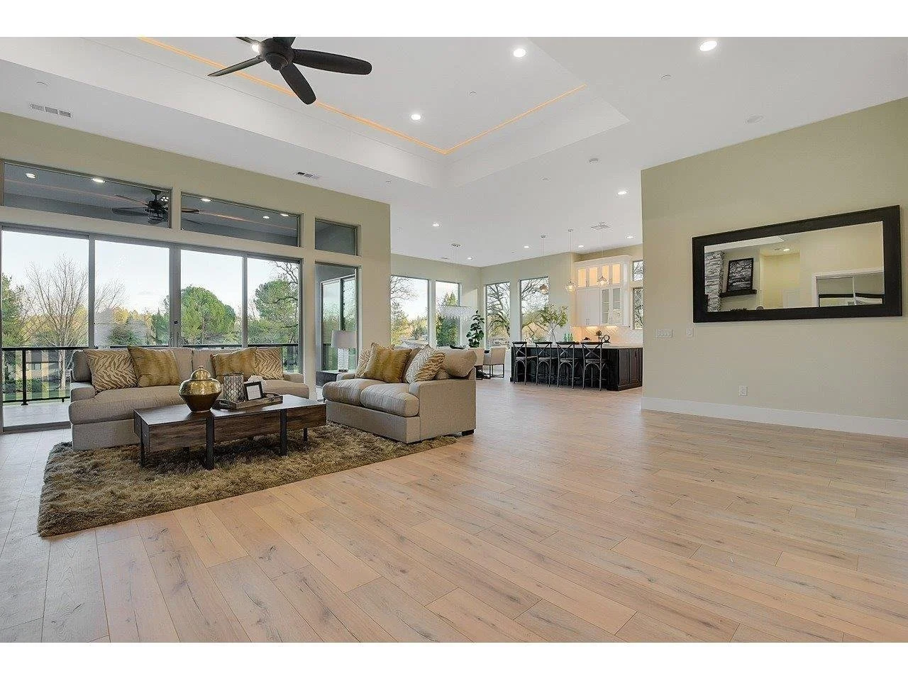 Bright, open living area seamlessly connected to the kitchen and outdoor views through full-height sliding glass doors. The modern ceiling design with recessed lighting adds a clean architectural touch, while the wide-plank flooring unifies the entire space