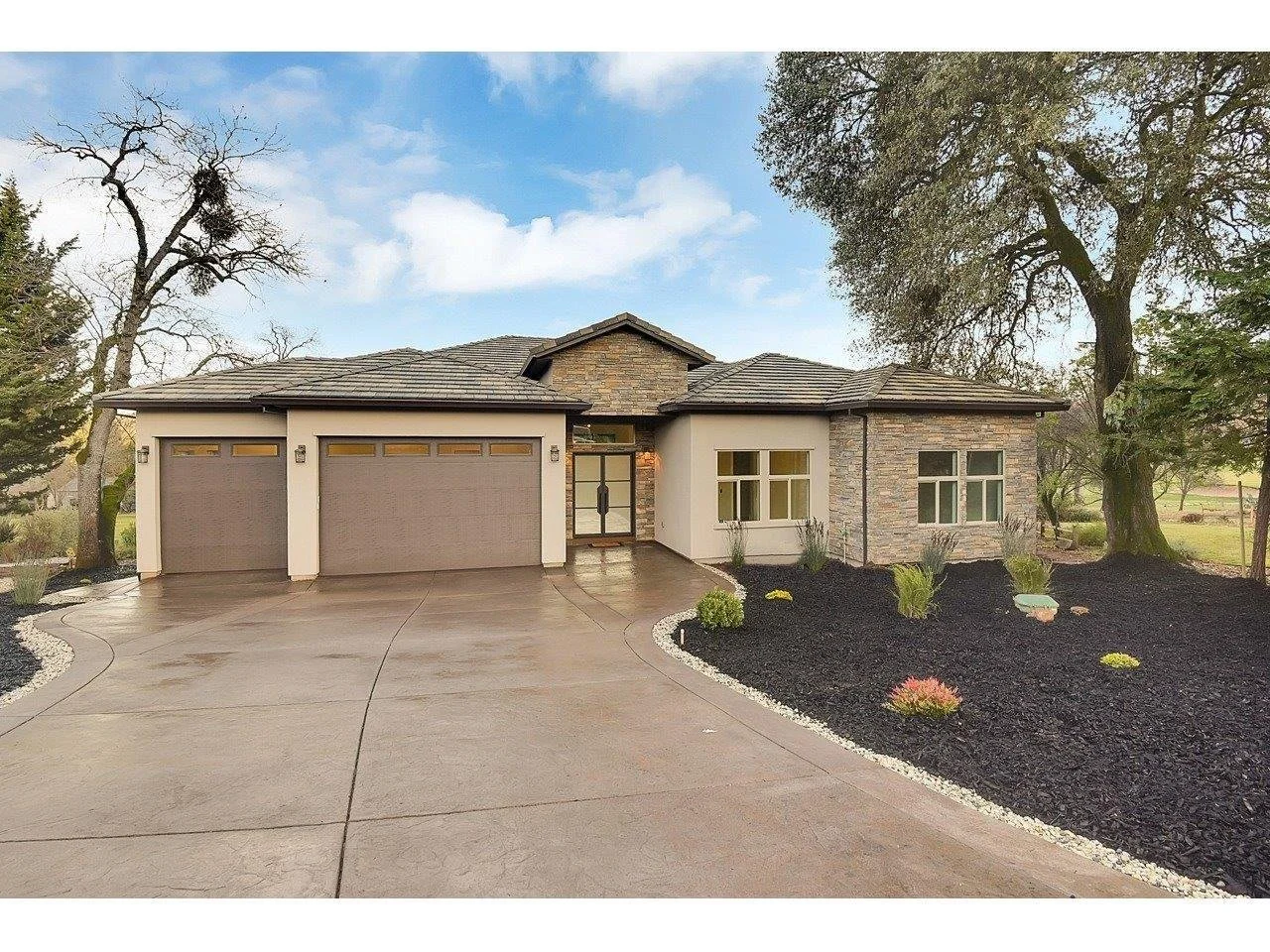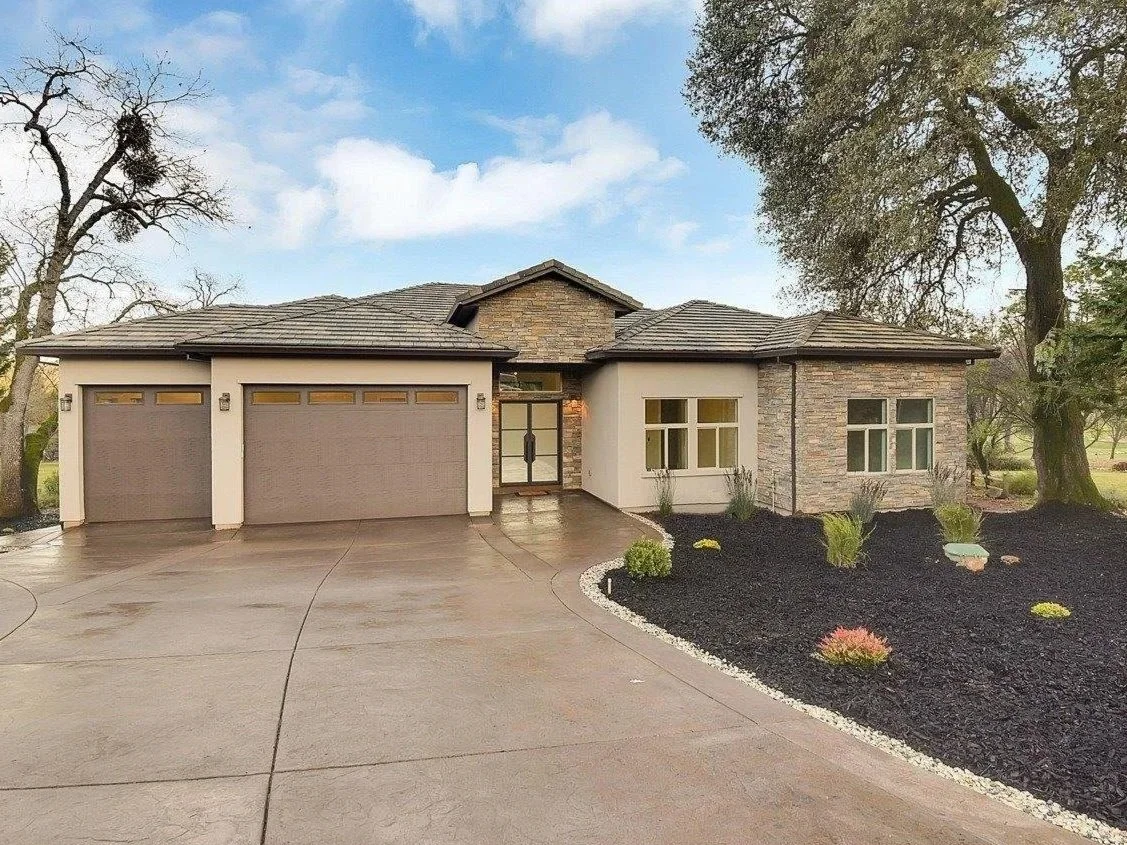 Custom single-story home featuring a modern exterior with stone accents, clean roof lines, and large windows that frame the surrounding landscape. Designed and built with a focus on timeless aesthetics and high-quality materials.