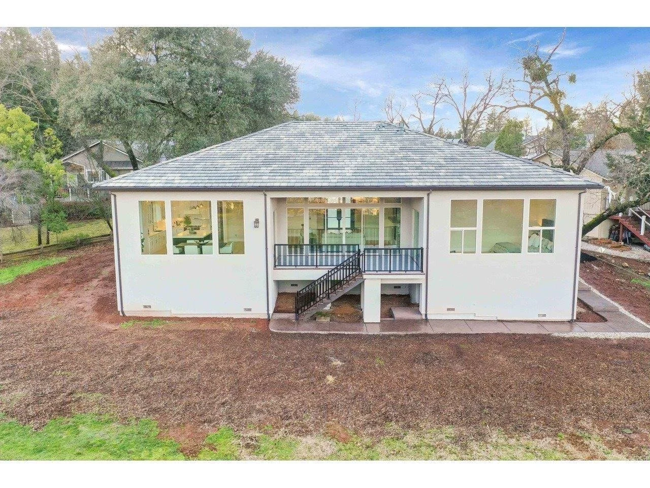 A rear elevation of the completed custom home, highlighting the covered patio, large energy-efficient windows, and clean modern exterior lines. This view showcases the home’s elevated foundation and seamless indoor-outdoor connection.