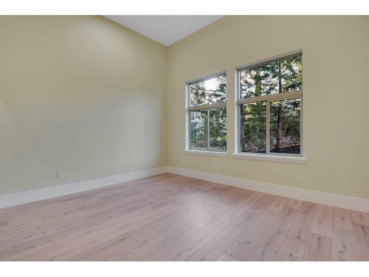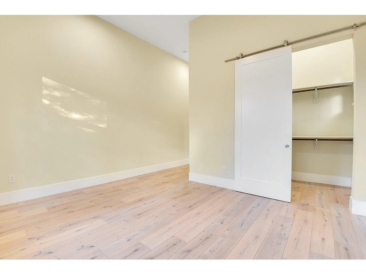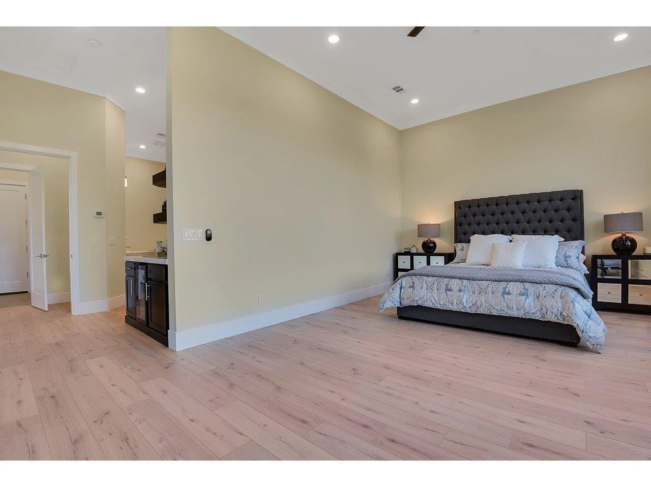 A spacious primary bedroom featuring high ceilings, soft neutral tones, and wide-plank hardwood flooring. The open layout includes a private wet bar, creating an elevated and functional retreat within the home.