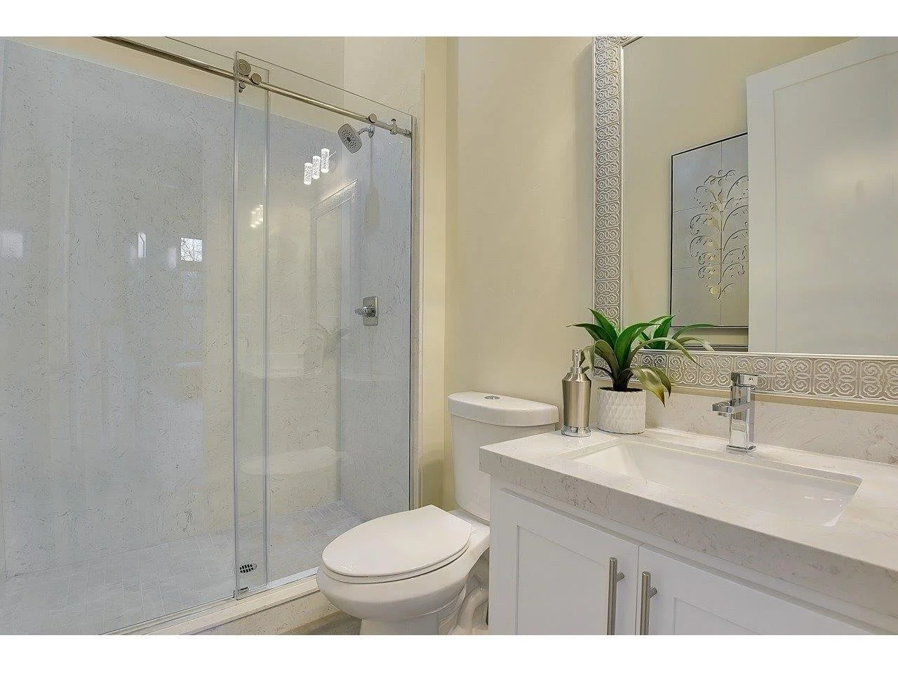 Elegantly finished guest bathroom featuring a sleek walk-in shower with glass sliding doors, modern fixtures, and a clean quartz vanity. Soft neutral tones and subtle decorative details create a bright and inviting space.