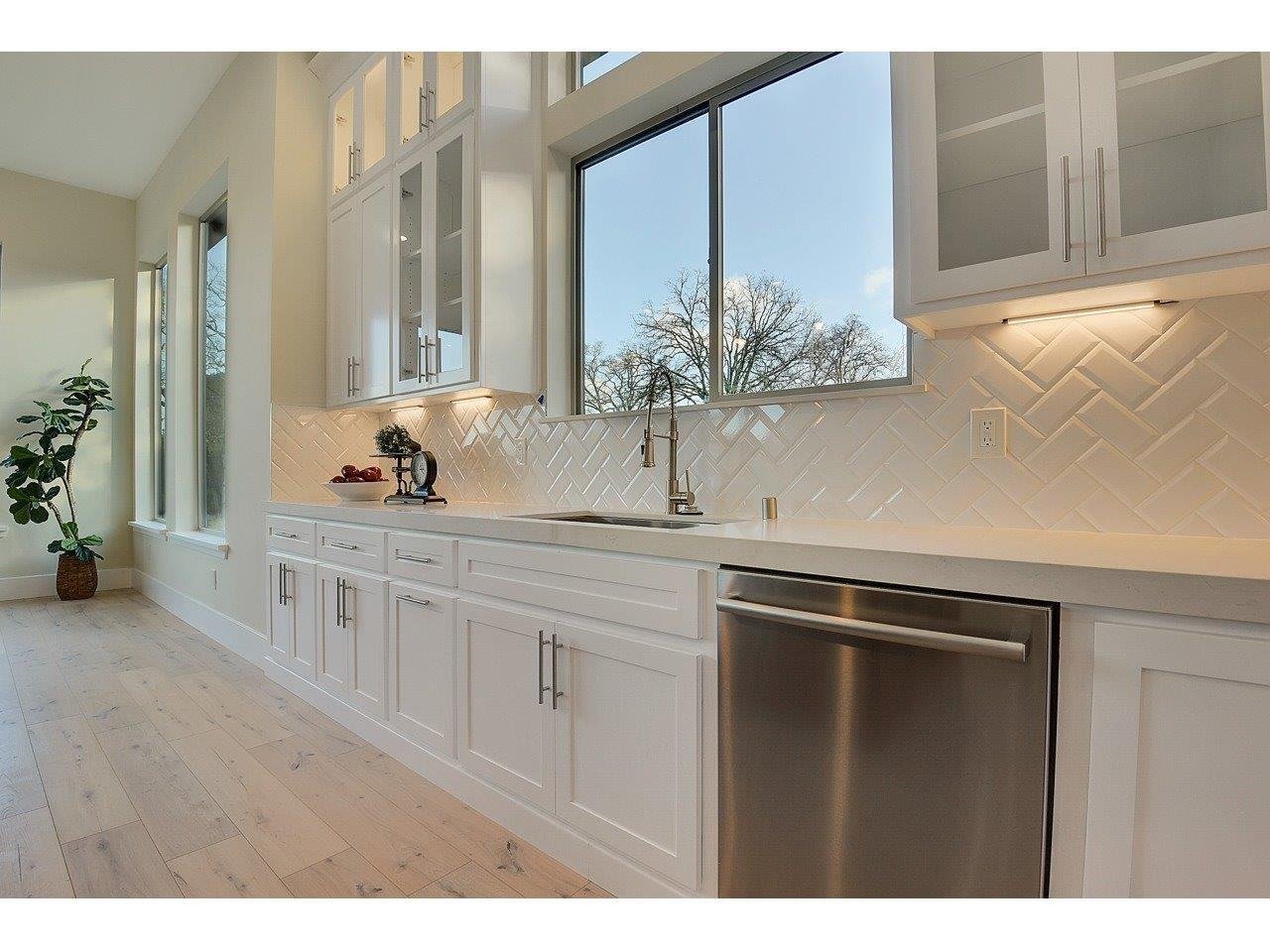 Bright, airy kitchen wall featuring custom white cabinetry, a large picture window with scenic views, and a clean herringbone tile backsplash. The space highlights premium finishes, under-cabinet lighting, and a seamless blend of natural light and modern design