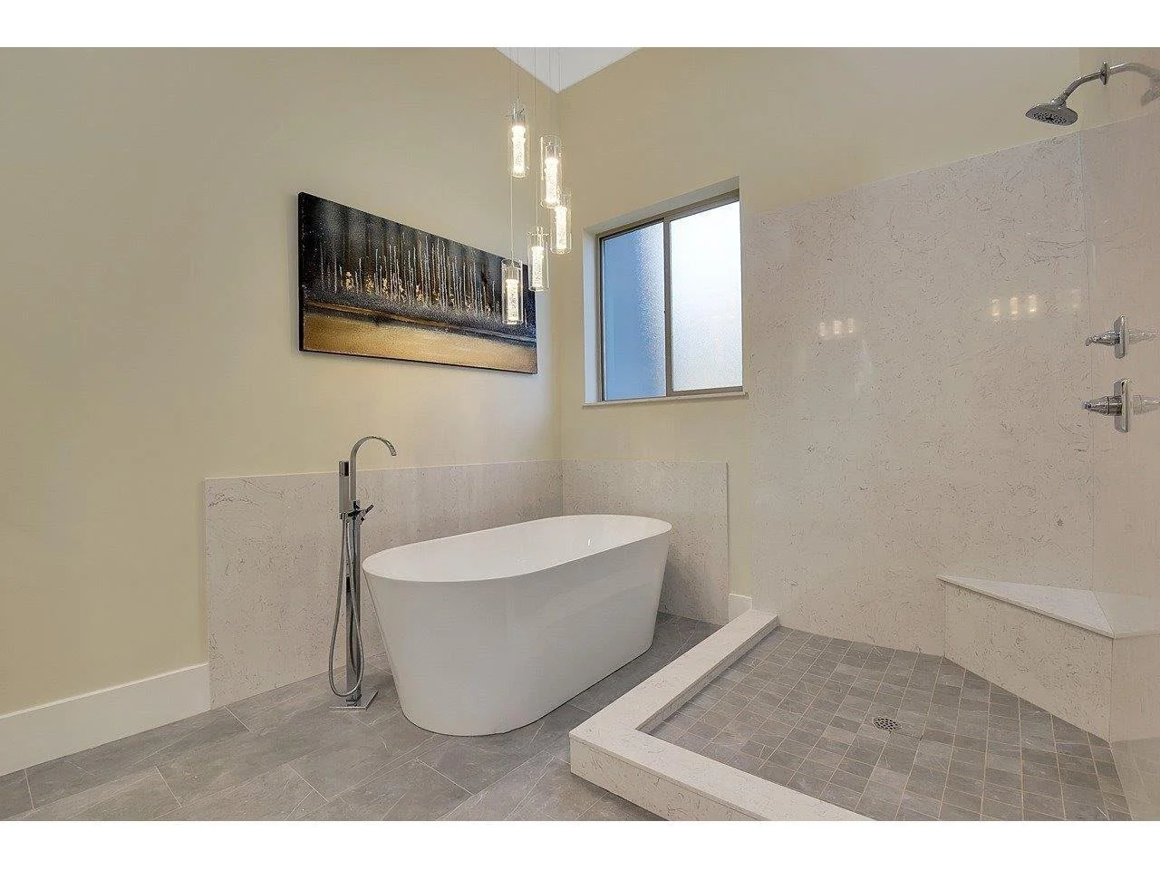 A serene primary bathroom featuring a modern freestanding tub and an open walk-in shower wrapped in sleek quartz walls. Soft lighting and clean lines create a calm, spa-like atmosphere.