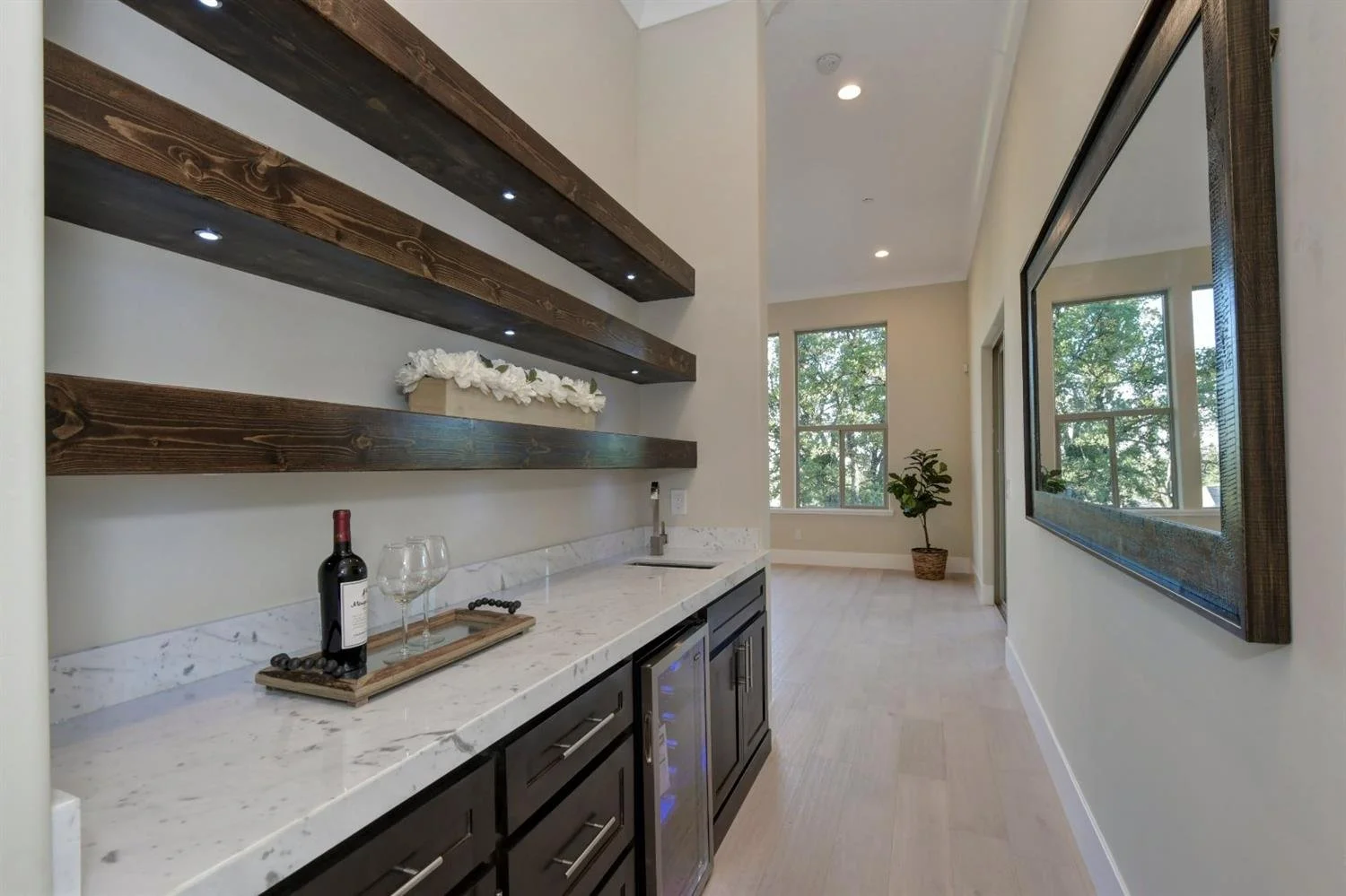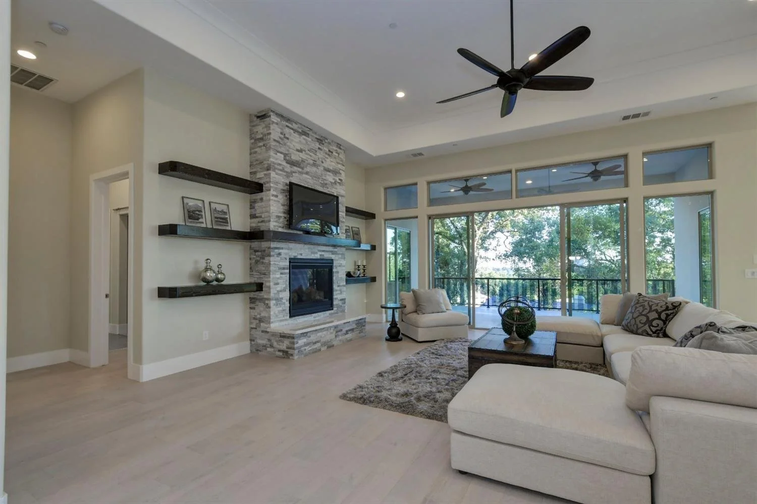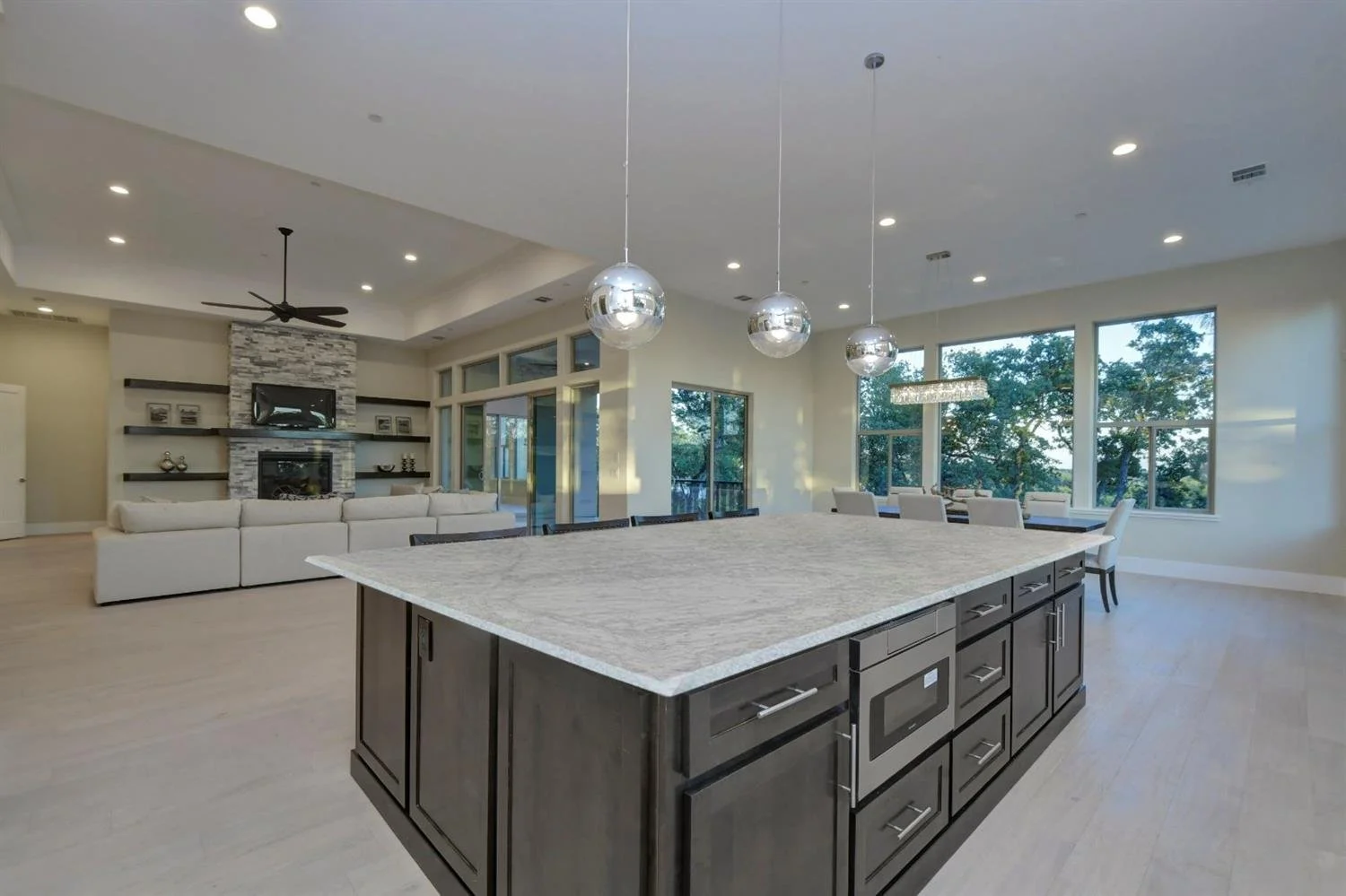 Open Concept living and kitchen offers breathtaking view of foothills, the valley, and gorgeous sunsets! Extra large walk-in pantry, gourmet kitchen with gas Verona Range, micro drawer with warmer and extra tall cabinets, huge kitchen island with double-sided cabinets, undercabinet and inside cabinet lights; master suite with wet bar and patio access conveniently located separately from other bedrooms on the opposite side, featuring a huge walk-in closet and bathroom with rainfall shower head and elegant freestanding tub. Custom shelving above bar area and around gas fireplace, wide plank hardwood floors throughout the house; solid quartz slab wall and bath surrounds; 3+ car garage with 14-foot ceiling, insulated garage doors and epoxy floor finish; laundry room with full-size sink; tankless water heater and many more custom finishes and touches throughout